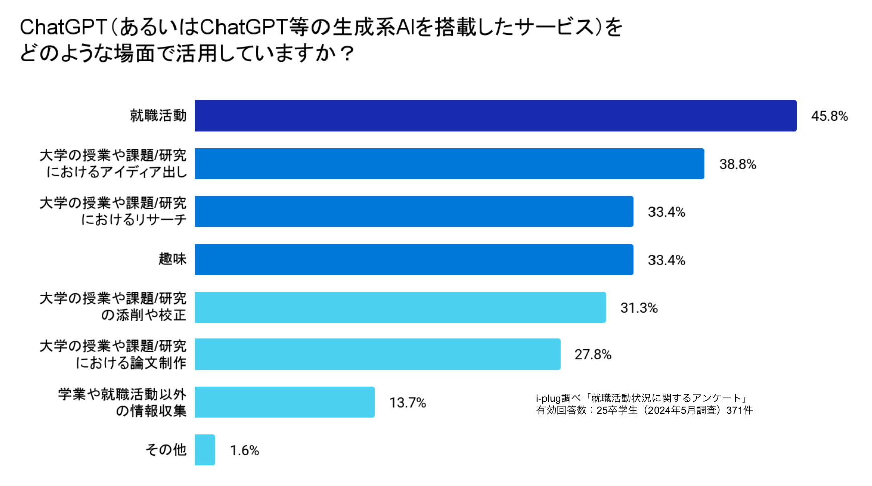 活用場面について伺ったところ「就職活動」が最多の45.8%。他にも、大学の授業や課題/研究で活用していることがわかりました。