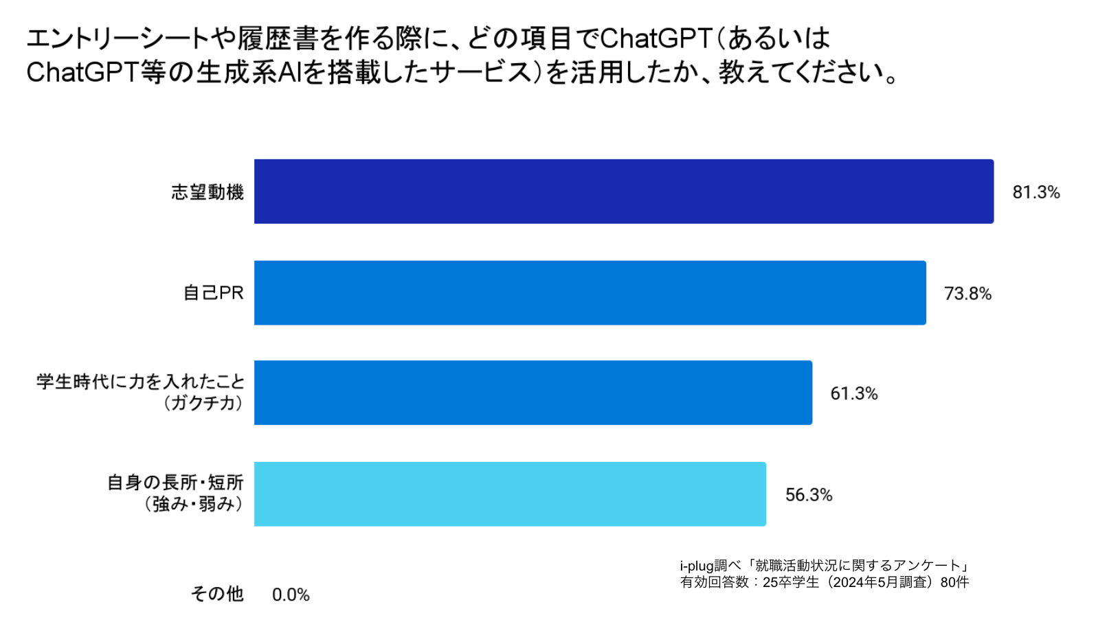 エントリーシートや履歴書の作成に活用している学生に、どの項目でChatGPT等を活用しているか伺うと、「志望動機」が最多の81.3%でした。次いで「自己PR」が73.8%。
