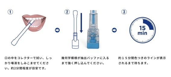 特殊な装置や専門知識も必要ありません。唾液を採取するだけなので、だれでも簡単に検査できます。