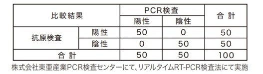当社PCR検査との比較時実験(陽性50検体、陰性50検体)では、陽性陰性一致率100%です。