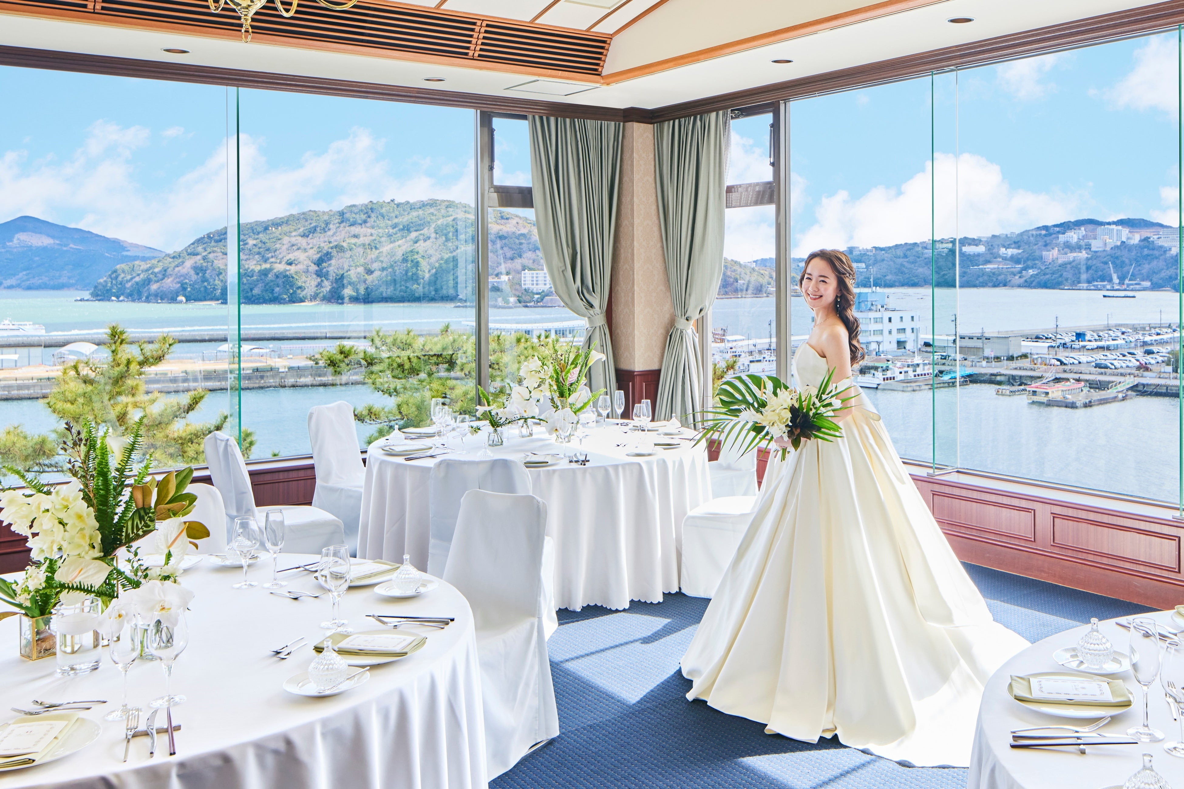 披露宴は、ご人数に合わせ大小さまざまな会場をご用意。ご家族だけのアットホームな会食や、カジュアルなパーティー、大人数の披露宴まで、参列人数に応じてご提案をさせていただきます。全ての会場からは、鳥羽湾の美景も望められるので、絶景という演出もプラスされ、おふたりの思いや個性に合わせたコーディネートも叶います。
