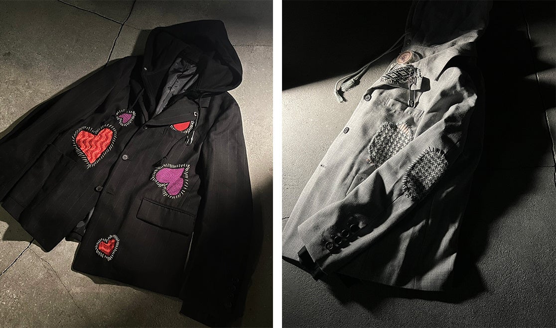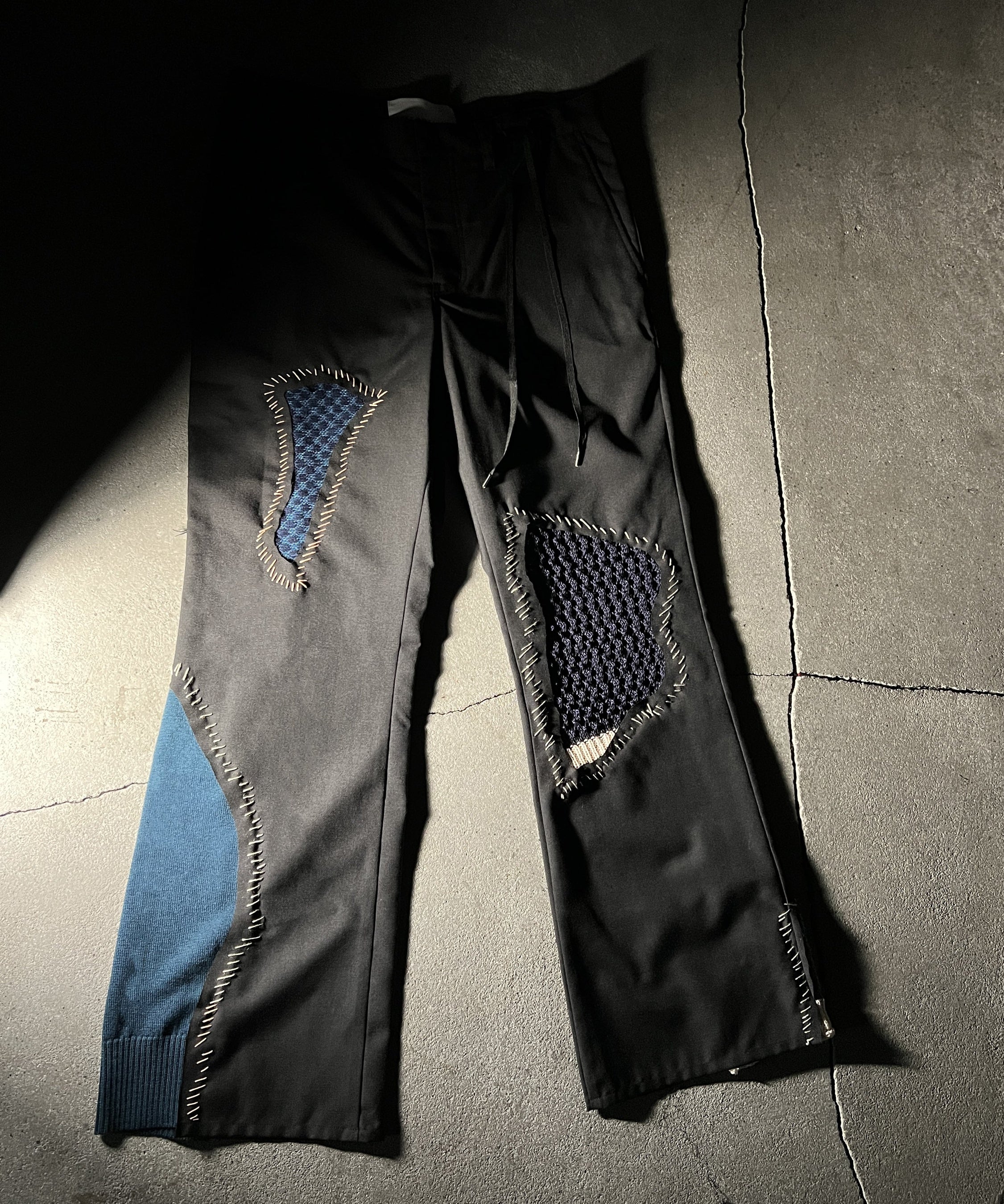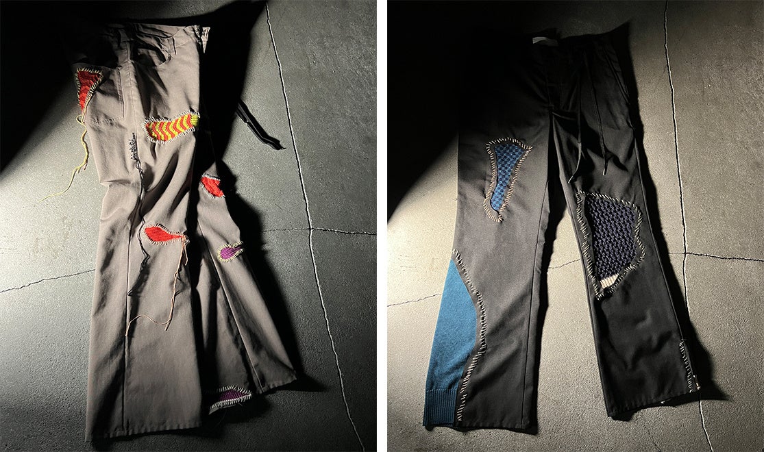 今回のコラボレーションアイテムは、DIET BUTCHER既存のジャケットやプルオーバーシャツやフレアパンツに、ニット工場の余り糸で製作したsonatine特有のニットパーツを大胆に、手作業のかがり縫いでパッチワークしたスペシャルなデザインです。