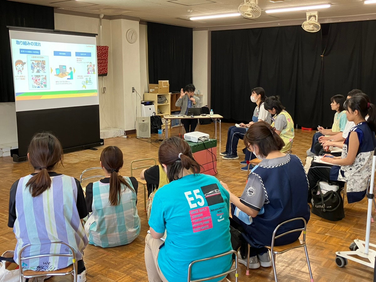 今回の実証実験では、担任保育士の方にウェアラブルカメラを装着いただき、後日、撮影した目線動画を上映しながら、担当・担当外問わず、保育職員の皆さまにお集まりいただき、学習会(フィードバック会)を実施しました。