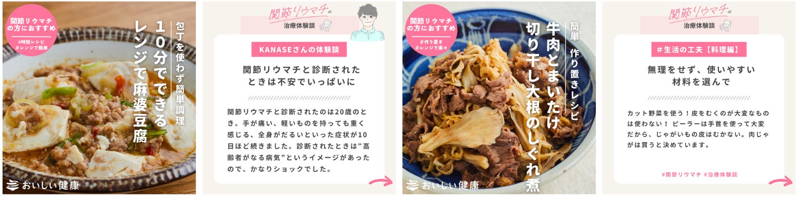 さらなる情報発信の場として、インスタグラムアカウントを開設。ここでは、関節リウマチと向き合う方の生活・治療の体験談のほか、おいしい健康の管理栄養士が監修した『体調にあわせて選べるレシピ』を随時発信しています。開設5ヶ月でフォロワー数は1600人を超え、多くの方にご利用いただいています。ぜひフォローして最新の情報をご覧ください。