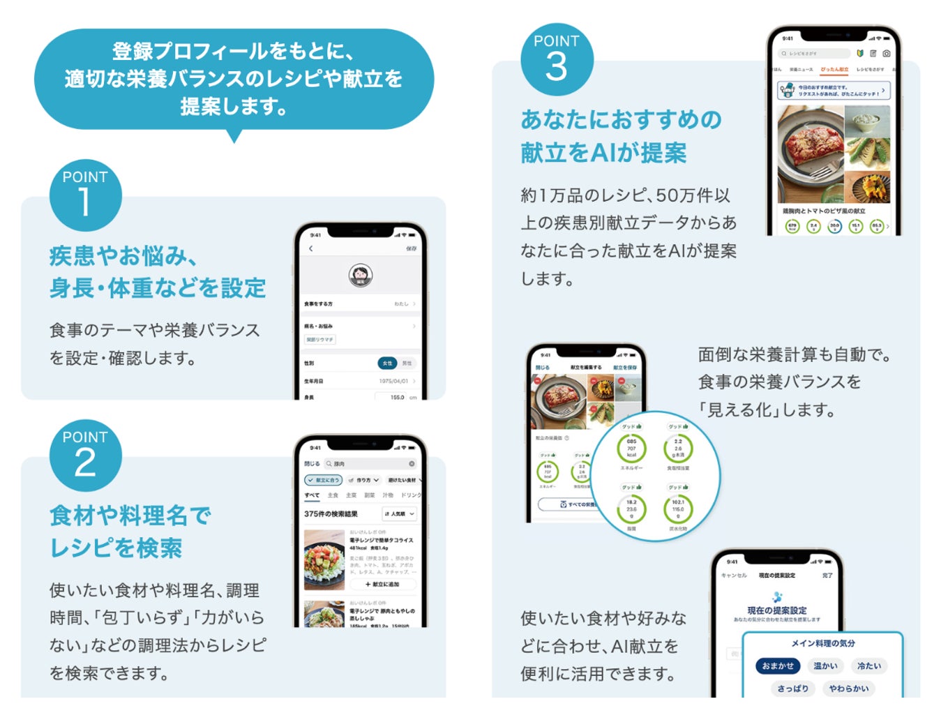 AI献立・栄養管理アプリ『おいしい健康』は、利用者の健康状態や疾患、食の好みなどに合わせた最適な献立・レシピをAIが提案する、パーソナライズ食事管理サービスです。 厚生労働省「日本人の食事摂取基準」および各疾患の診療ガイドラインに準拠した食事、または医療機関から指示される食事療法の内容に基づき、予防、ダイエット、疾患ごとの食事管理を、ご家庭で手軽に実践いただけるよう支援いたします。