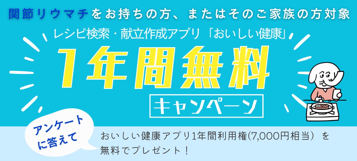 関節リウマチをお持ちの方々が抱える食事に関するお悩みをサポートするために、AI献立・栄養管理アプリ『おいしい健康』を1年間無料でご利用いただけるキャンペーンを実施中です。アプリ『おいしい健康』は、管理栄養士監修の1万品以上のレシピと約100万件の疾患別メニューから、健康状態に適した栄養バランスの食事を見つけることができます。関節リウマチをお持ちの方には栄養バランスが良いことはもちろん、関節負担の少ない手順や調理法に着目したレシピコンテンツを多数提供しております。この機会に、ぜひ『おいしい健康』をお試しください。