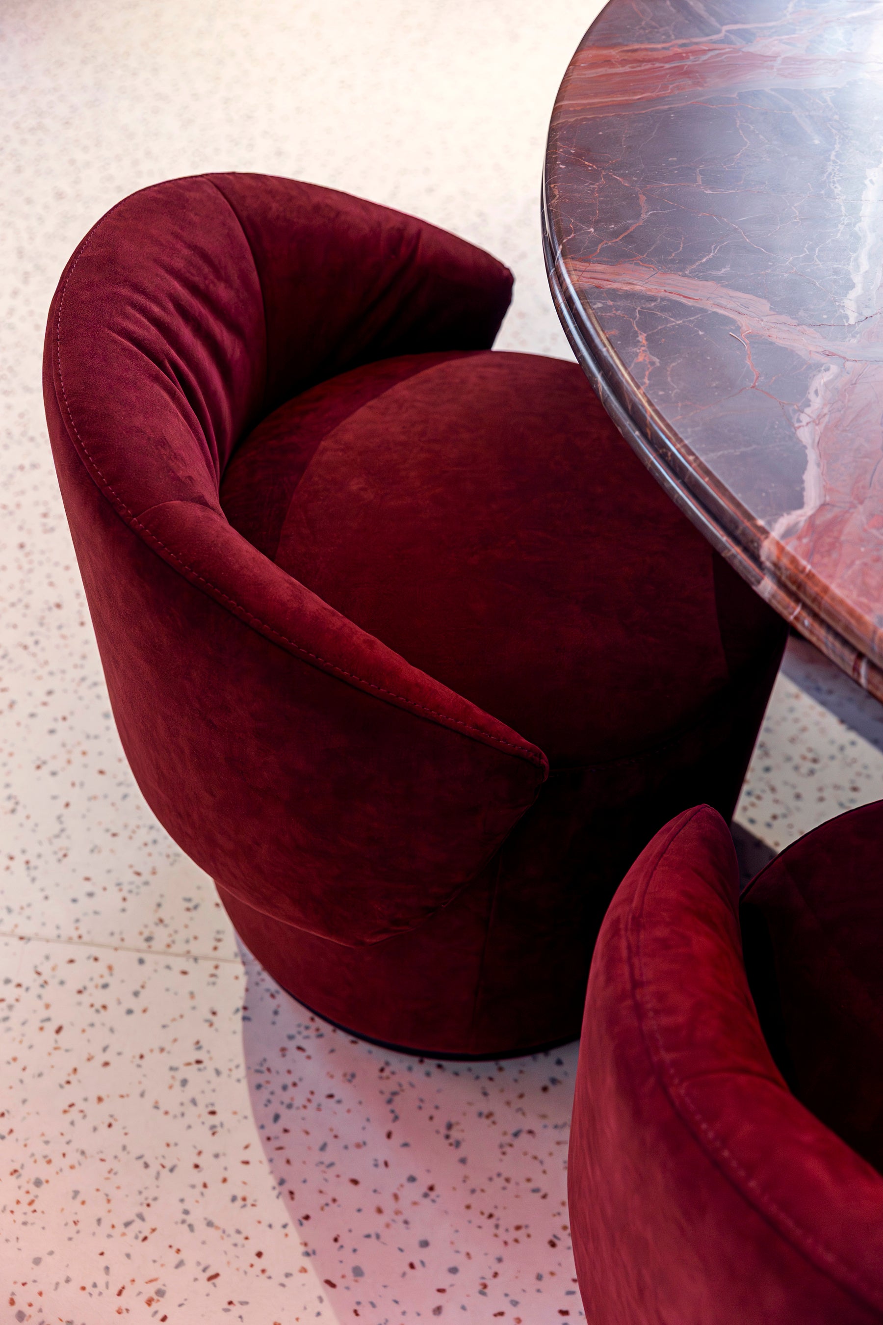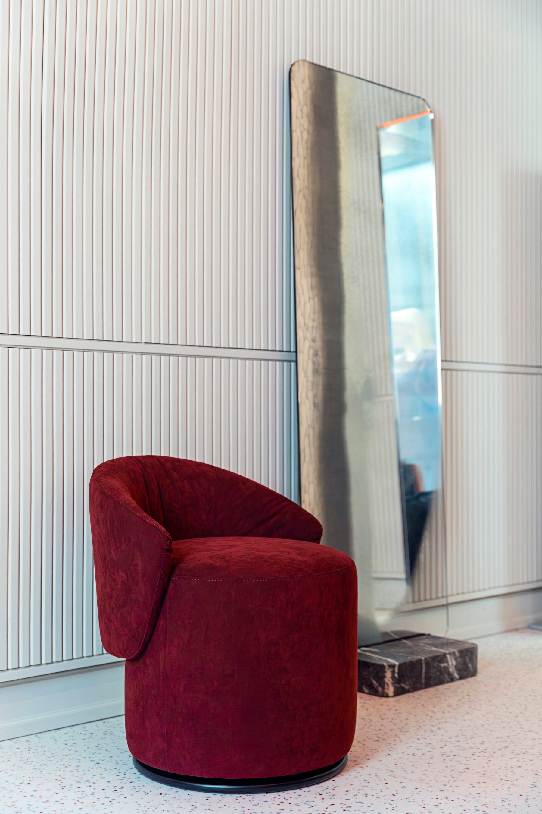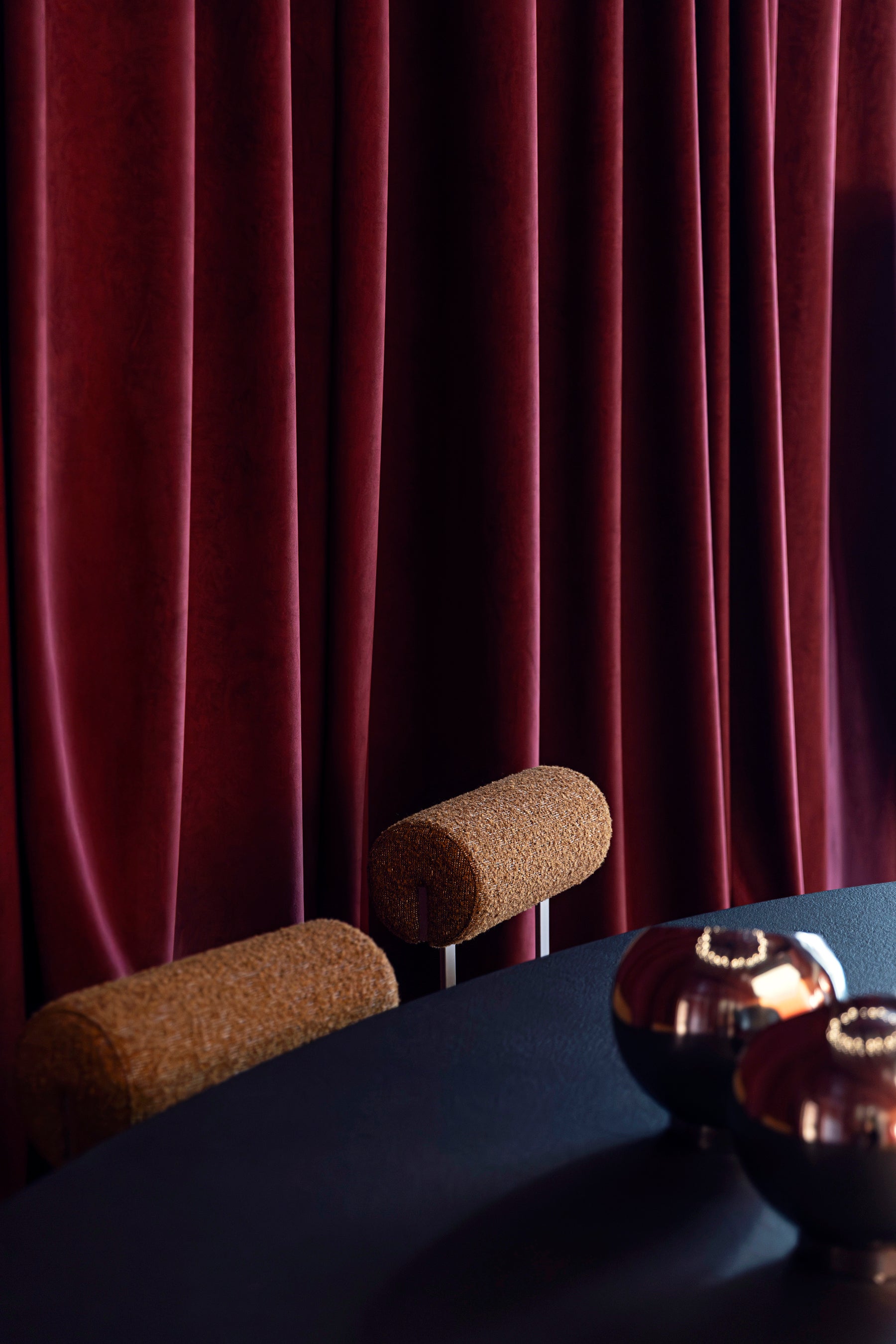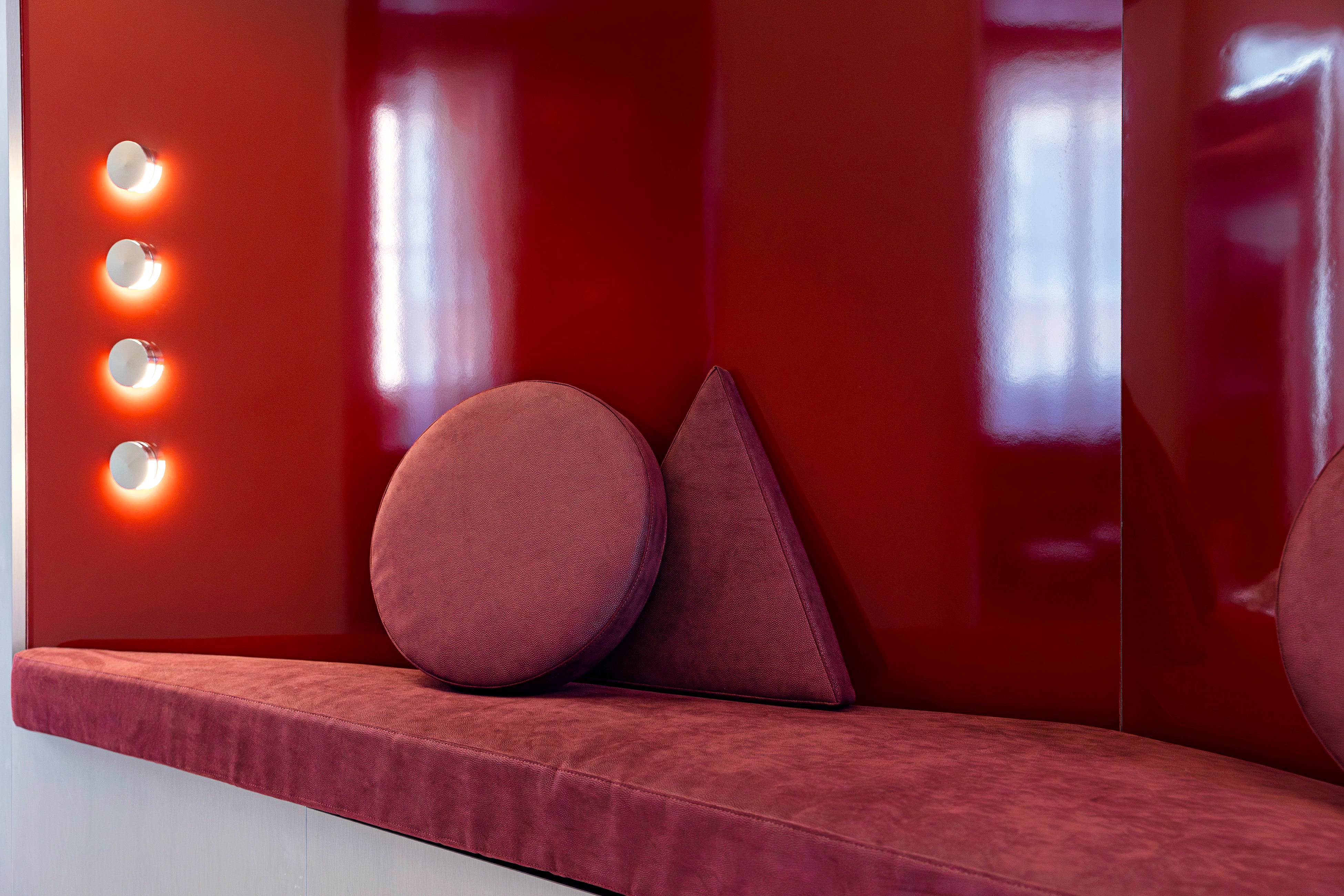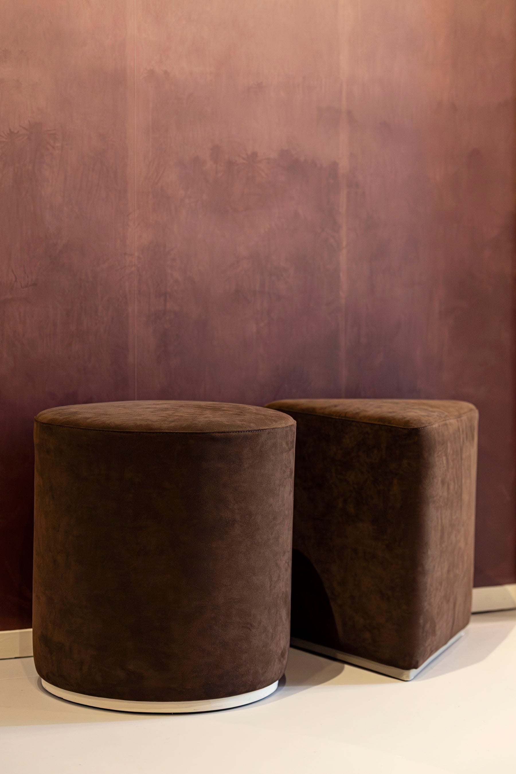 このインスタレーションのなかで、ALCANTARA®は、カーテンやアームチェア、プーフ、クッション、そして壁面装飾(ボワズリー)などのアイテムを温かみと力強さを併せ持つ光沢感のある色調で包み込み、ブランド特有のラグジュアリーな質感をもたらしています。また、伝統的な無地のALCANTARA®に、エンボス加工や斬新なメタリック調のラミネート加工を施すことで、素材の新たな表情も表現しました。