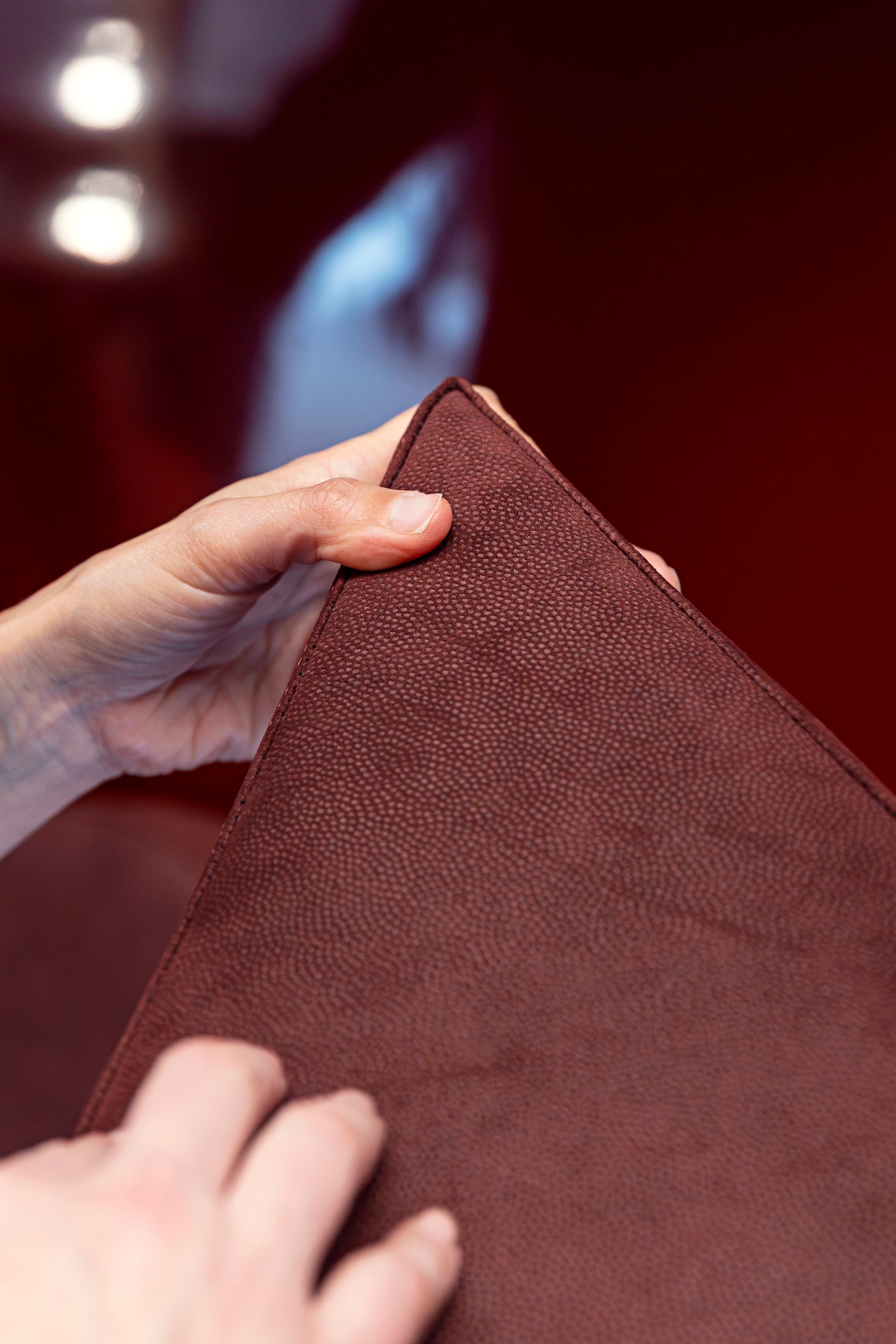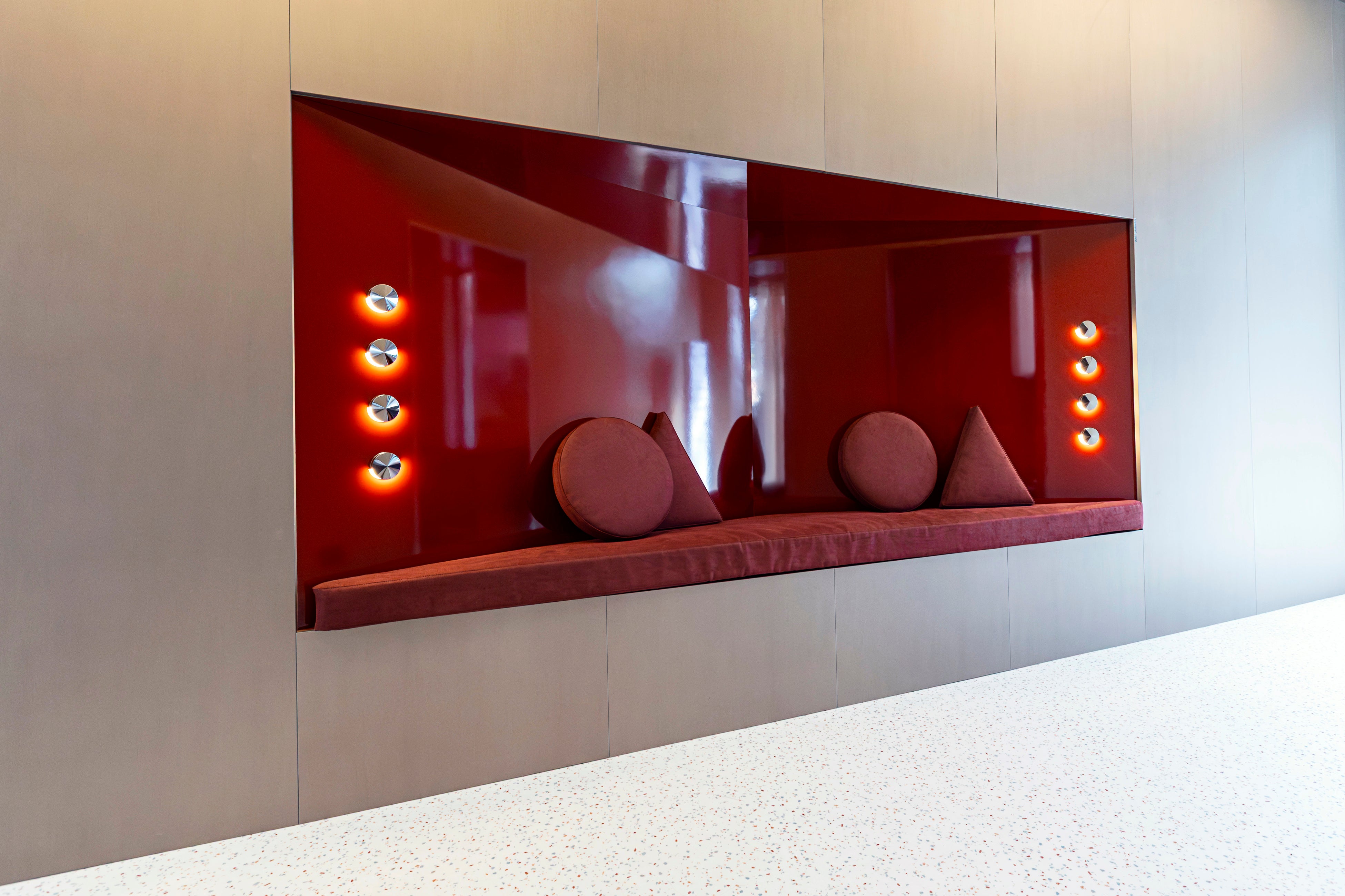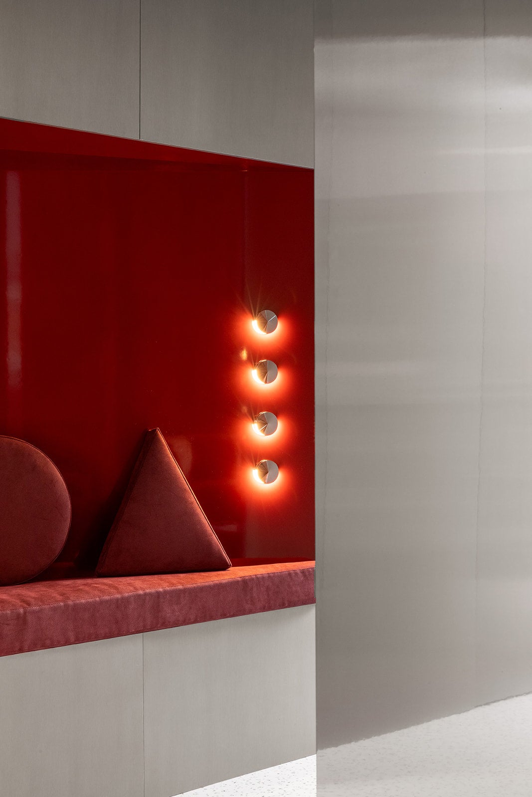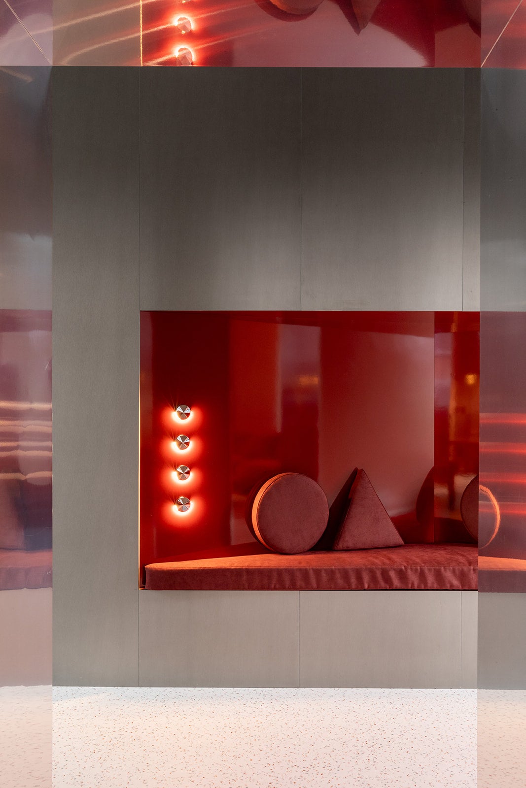 さらに展示エリアの最後には、3D熱成形技術を用いて立体的な石積みを表現した「ブニャート(bugnato)」様式の壁面が登場。ALCANTARA®の豊かなテクスチャーが光と影の美しい陰影を際立たせ、空間をドラマチックに演出しています。