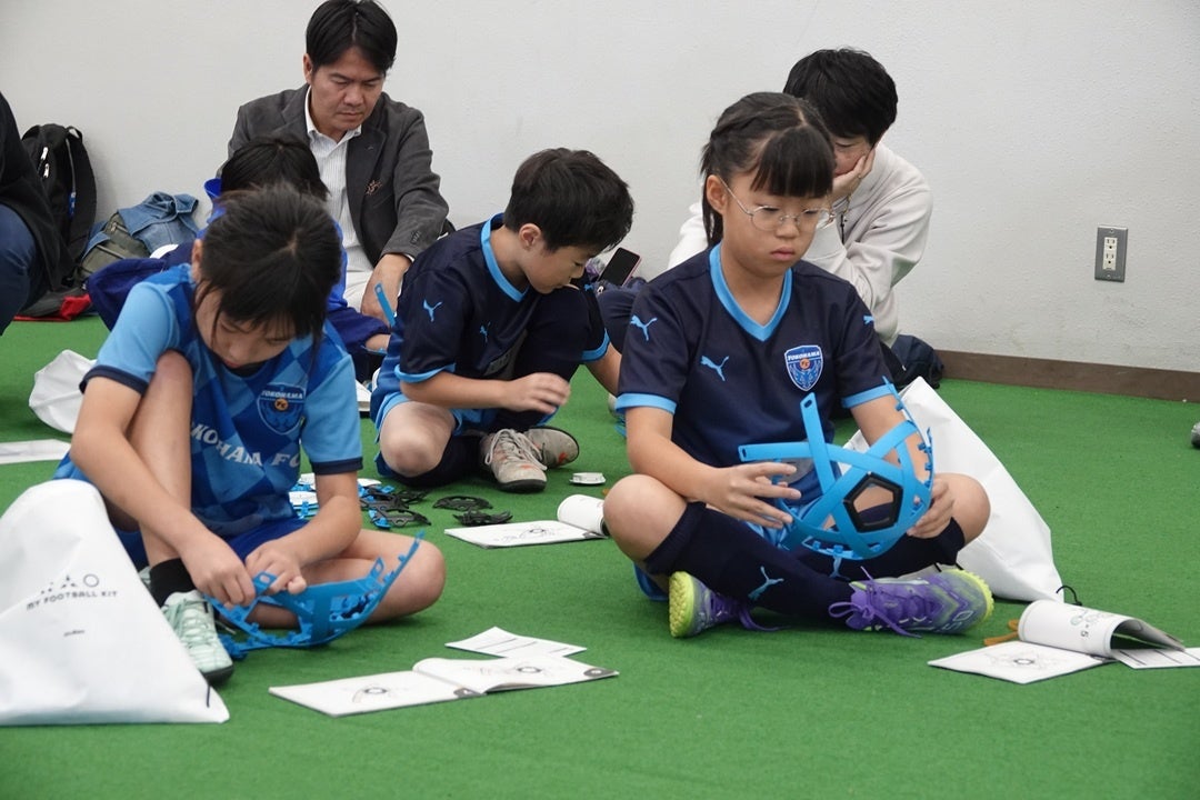 ウォーミングアップとして、環境に配慮した組み立て式のサッカーボール「MY FOOTBALL KIT」を用いてオリジナルのサッカーボールを製作しました。