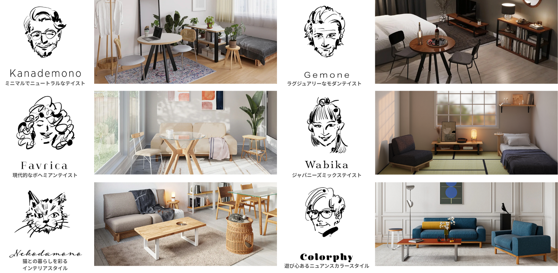 多様な美意識に寄り添いながら「自分らしいスタイル」と出会えるよう、KANADEMONOでは6つの異なるスタイルを提案。お部屋づくりをより創造的に、自由にするサポートをしています。