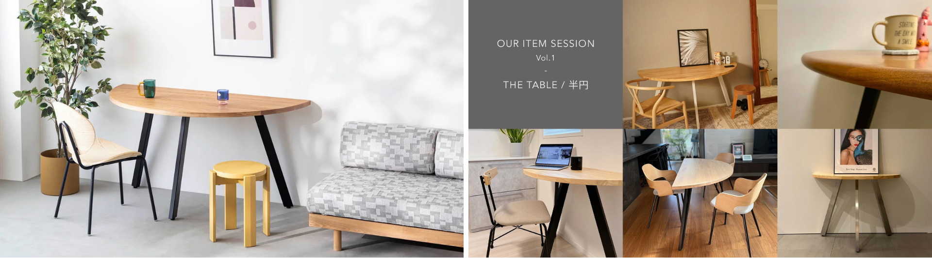 ダイニングスペースにもワークスペースにもフィットする汎用性と、空間を最大化するフォルムを併せ持つ、ユニークな半月型のフォルムが特徴。ラウンドテーブルに憧れているけれどスペースの問題で諦めていた、という方にも取り入れやすいアイテムです。
