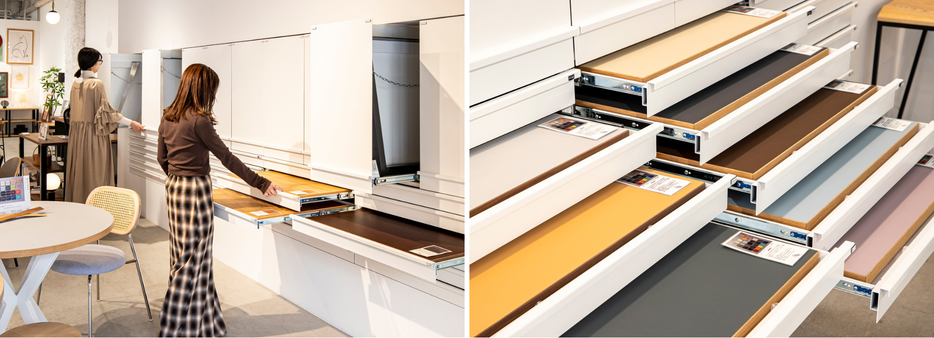 「どんな組み合わせを選べばいいのか」「サイズは合うのか」といった不安には、ショールーム常駐スタッフが、素材・サイズ・組み合わせの考え方まで、丁寧にご案内します。