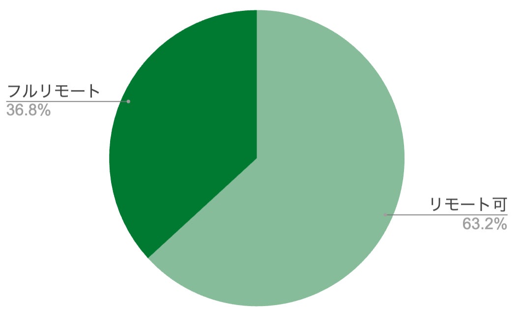 Unityの案件におけるリモートワークの状況を見ると、一部リモート可能な案件が63.2%を占めており、過半数の案件で柔軟な働き方が可能です。さらに、フルリモート(完全在宅)が可能な案件も36.8%あり、合わせると全案件の100%でリモートワークが何らかの形で認められています。この数字は、Unityの開発環境がリモートワークと相性が良いこと、また業界全体としてリモートワークへの適応が進んでいることを示しています。