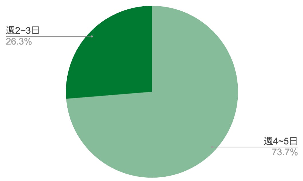 Unityエンジニアの稼働日数に関するデータを見ると、週4〜5日の稼働が73.7%を占めており、大多数のエンジニアがフルタイムに近い形で働いていることがわかります。一方、週2〜3日の稼働は26.3%となっており、パートタイムや副業として携わるエンジニアも一定数存在します。このデータからは、Unityの案件が比較的安定した長期プロジェクトが多いことや、フルタイムでの需要が高いことが推測できます。