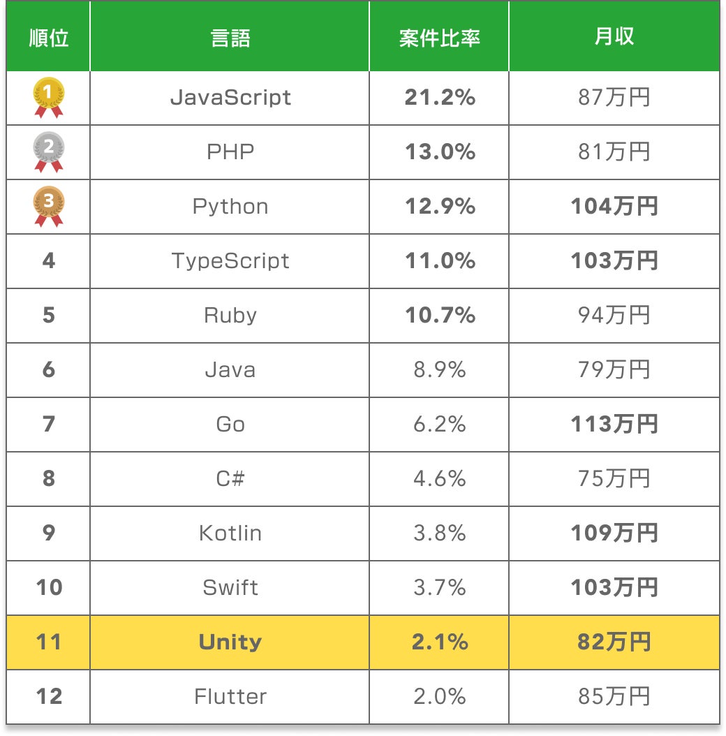 Unityの案件数は全体の案件数の2.1%を占めており、これは案件数ランキングで11位に相当します。この数字は、Unityが比較的需要のある開発環境であることを示していますが、トップ10には入っていないことから、主流の言語やフレームワークほどの案件数ではないことがわかります。
