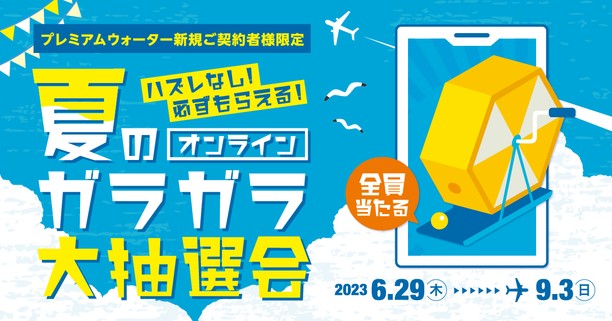 6月29日(木)~ 9月3日(日)のキャンペーン期間中に、プレミアムウォーターを新規でご契約された方限定で『ハズレなし、必ずもらえる!夏のオンラインガラガラ大抽選会!』にご参加いただけます。