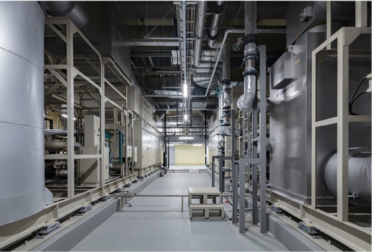 また、コジェネレーションシステムを活用して電力の自給と日中帯のピークカットを実施し、発電時に排出される熱を空調熱源として有効活用しています。