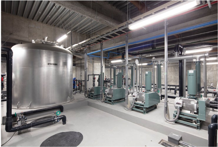 当施設から排出された雑排水などは、地下の中水設備で浄化してトイレの洗浄水として再利用しています。これにより、水資源の有効活用と下水道施設への負荷低減を実現しています。