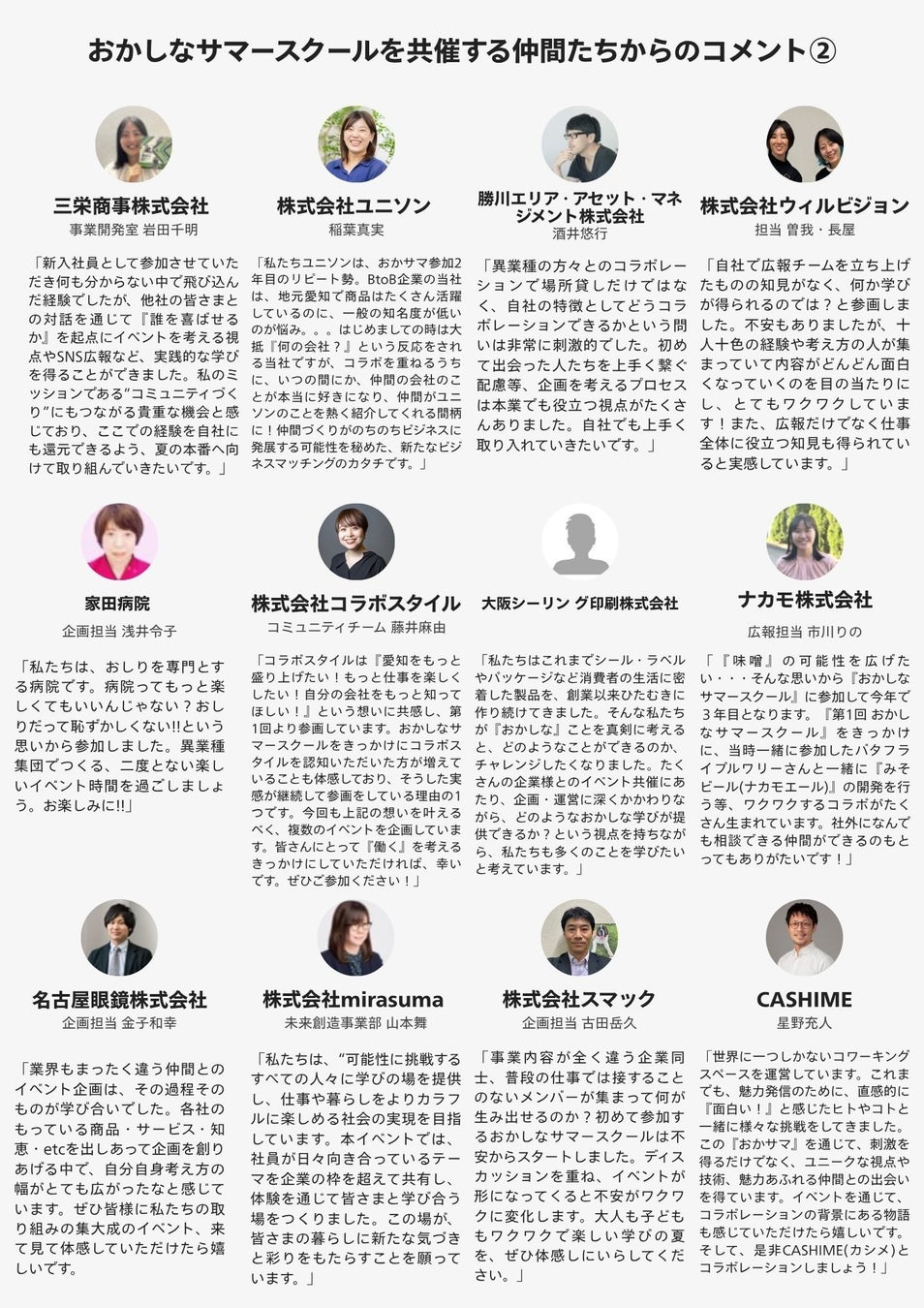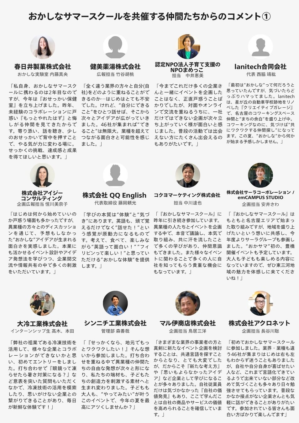 株式会社油勘、株式会社アクロネット、株式会社バッファロー、CASHIME、株式会社シアン、株式会社コラボスタイル、大冷工業株式会社、 Danchitects、株式会社de la hataraku、株式会社FabCafe Nagoya、豊通ファイティングイーグルス株式会社、東山遊園株式会社、医療法人愛知会家田病院、株式会社アイジーコンサルティング、株式会社ignArt、春日井製菓株式会社、健美薬湯株式会社、株式会社木村鋳造所、コクヨマーケティング株式会社、コーミ株式会社、クリスピー・クリーム・ドーナツ・ジャパン株式会社、lanitech合同会社、合同会社ライラ・カンパニー、マドラス株式会社、勝川エリア・アセット・マネジメント株式会社、認定NPO法人子育て支援のNPOまめっこ、マル伊商店株式会社、松田医薬品株式会社、名古屋眼鏡株式会社、中日本興業株式会社/ミッドランドスクエア シネマ、株式会社mirasuma、三菱地所株式会社、なごのキャンパス、名古屋造形大学、ナカモ株式会社、大阪シーリング印刷株式会社、株式会社QQ English、サーラグループ、三栄商事株式会社、シンニチ工業株式会社、株式会社スマック、株式会社タマディック、株式会社サンテフレスコ、株式会社ユニソン、独立行政法人都市再生機構、株式会社ウィルビジョン