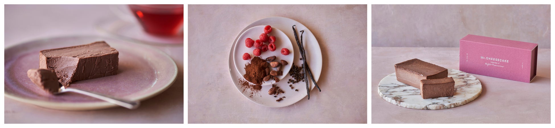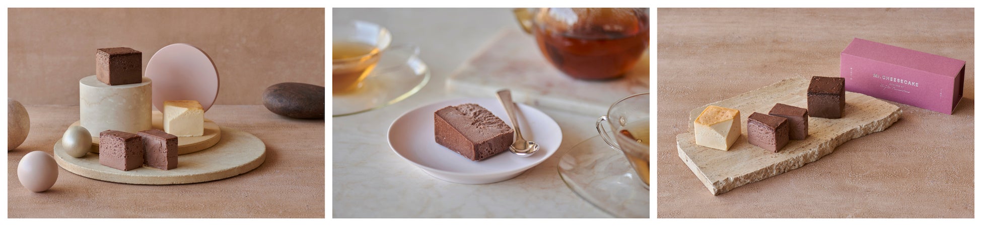 ショコラフランボワーズという定番の組み合わせをMr. CHEESECAKEらしく仕上げた「Chocolat Framboise」と、爽やかなラズベリーの酸味と華やかなバラの香りが広がる「Pink Raspberry」、甘味と香ばしさのあるキャラメルチョコレートにヘーゼルナッツのコクと時折感じるレモンピールが爽やかな「Camel Praliné Citron」の3種をオリジナルBoxに詰めてお届けします。