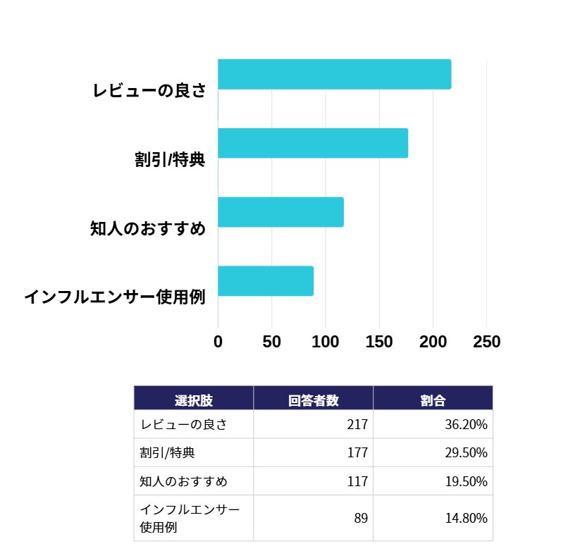 「知人のおすすめ」が19.5%と、「インフルエンサー使用例」の14.8%を上回り、身近なコミュニティの影響力の高さが浮き彫りになりました。