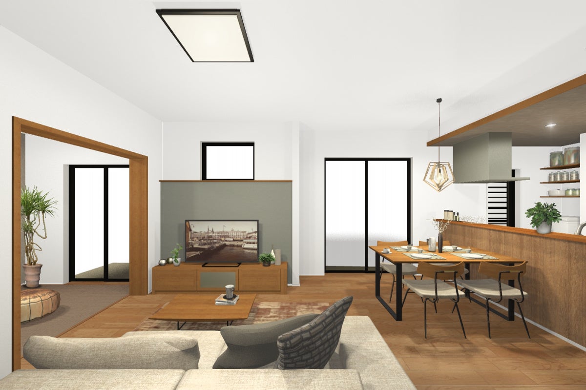 どちらも、リビングの続き間にテキスタイルフロアルームを設けました。扉を開け放てば、リビングとひと続きの大空間として使え、扉を閉めればプライベートな空間としても利用できます。