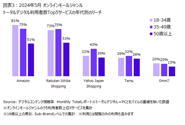 最後に、上位5サービスのリーチを年代別に見ると、18-34歳では「Amazon」が81%で最も高かった一方で、35歳以上では「Amazon」と「Rakuten Ichiba Shopping」が同程度利用されていることが分かりました。また、その他のサービスでは新しく参入した「Temu」を含めて35-49歳のリーチが他の年代と比べて高くなっていました(図表3)。