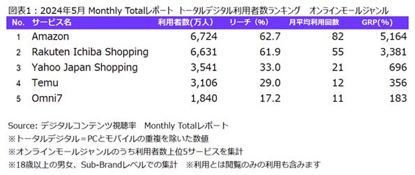 2024年5月のニールセン デジタルコンテンツ視聴率 Monthly Totalレポートによると、オンラインモールジャンルにおいて、PCとモバイルの重複を除いたトータルデジタルの利用者数が最も多かったのは「Amazon」で6,724万人、「Rakuten Ichiba Shopping」が6,631万人で続いていました。2023年7月に日本へ参入し、急速に利用者数を伸ばしている「Temu」は4位にランクインし、3,106万人に利用されていることが分かりました (図表1)。