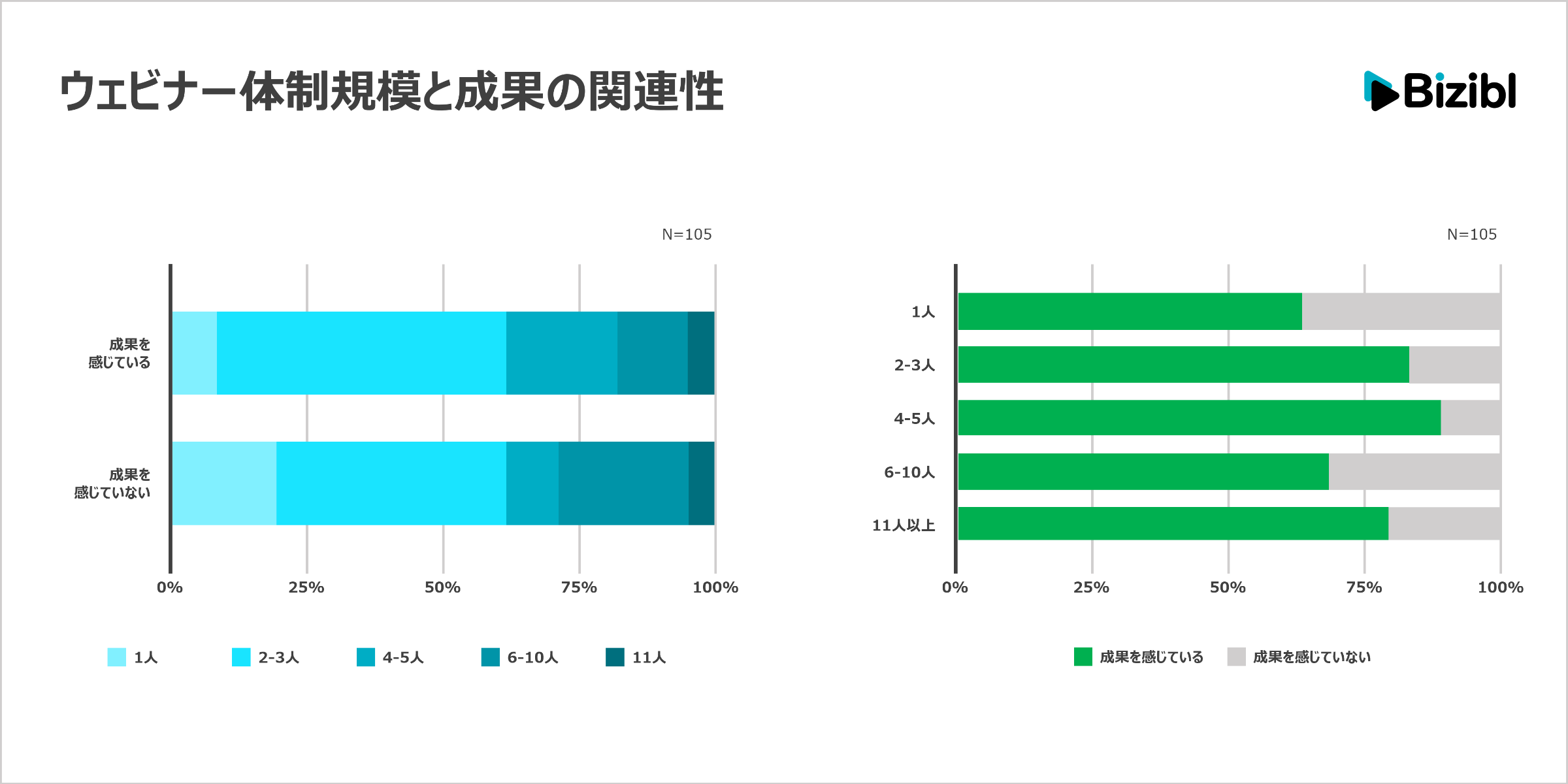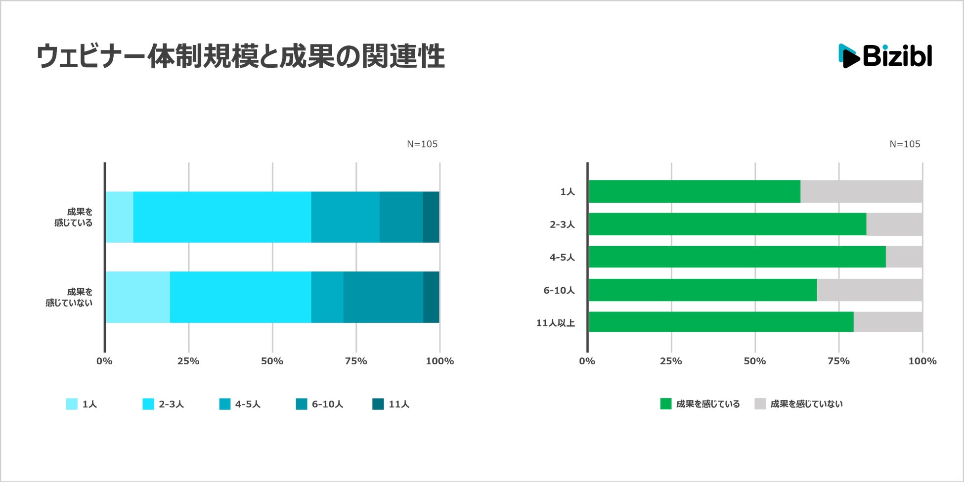 3)「ウェビナー運用への投下人員」は、「2−3人」が約51%と最も多く、「2人以上」での運用が90%となります。1人体制もしくは6人以上の体制になると成果を感じにくい傾向がわかります。