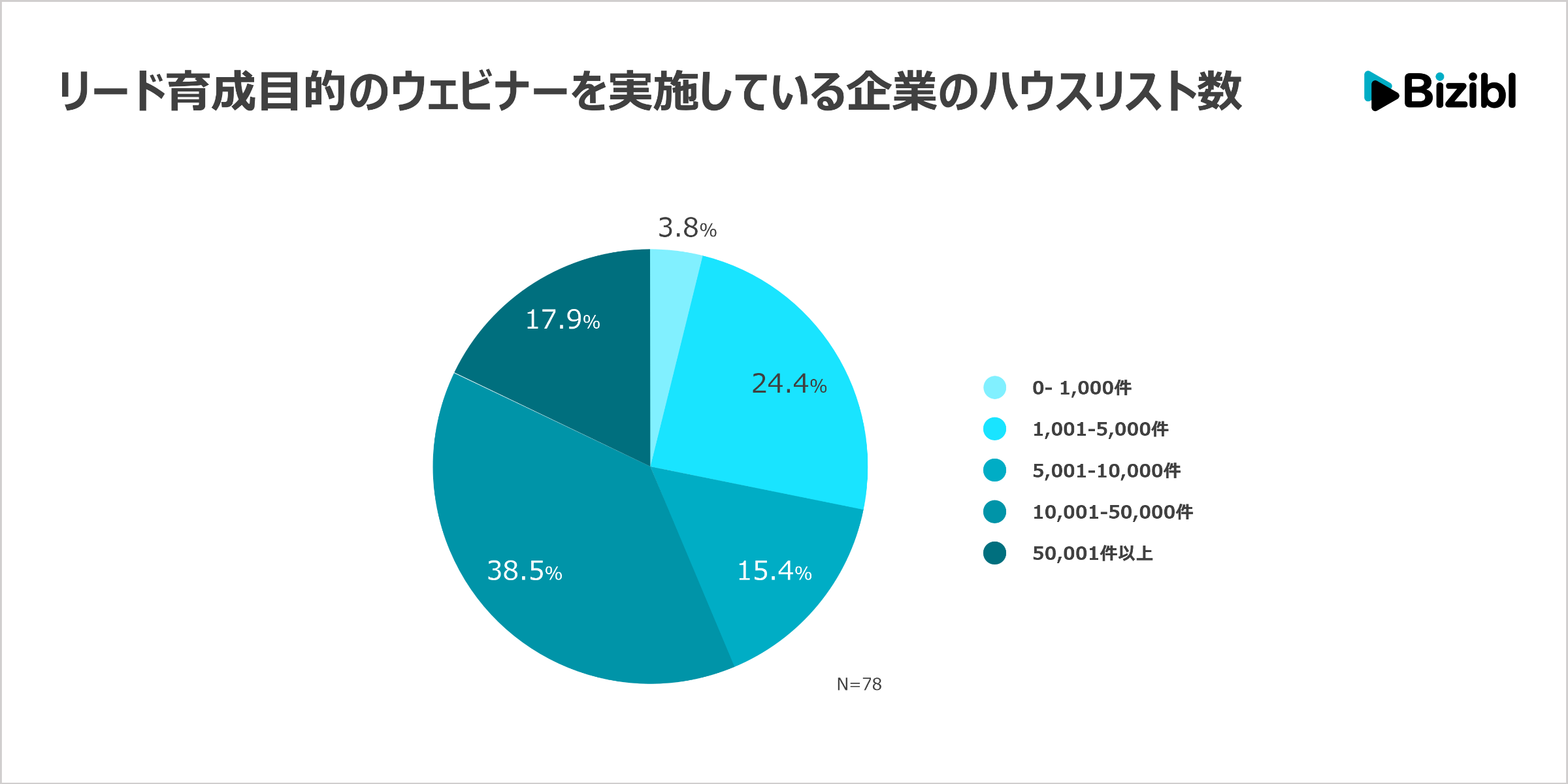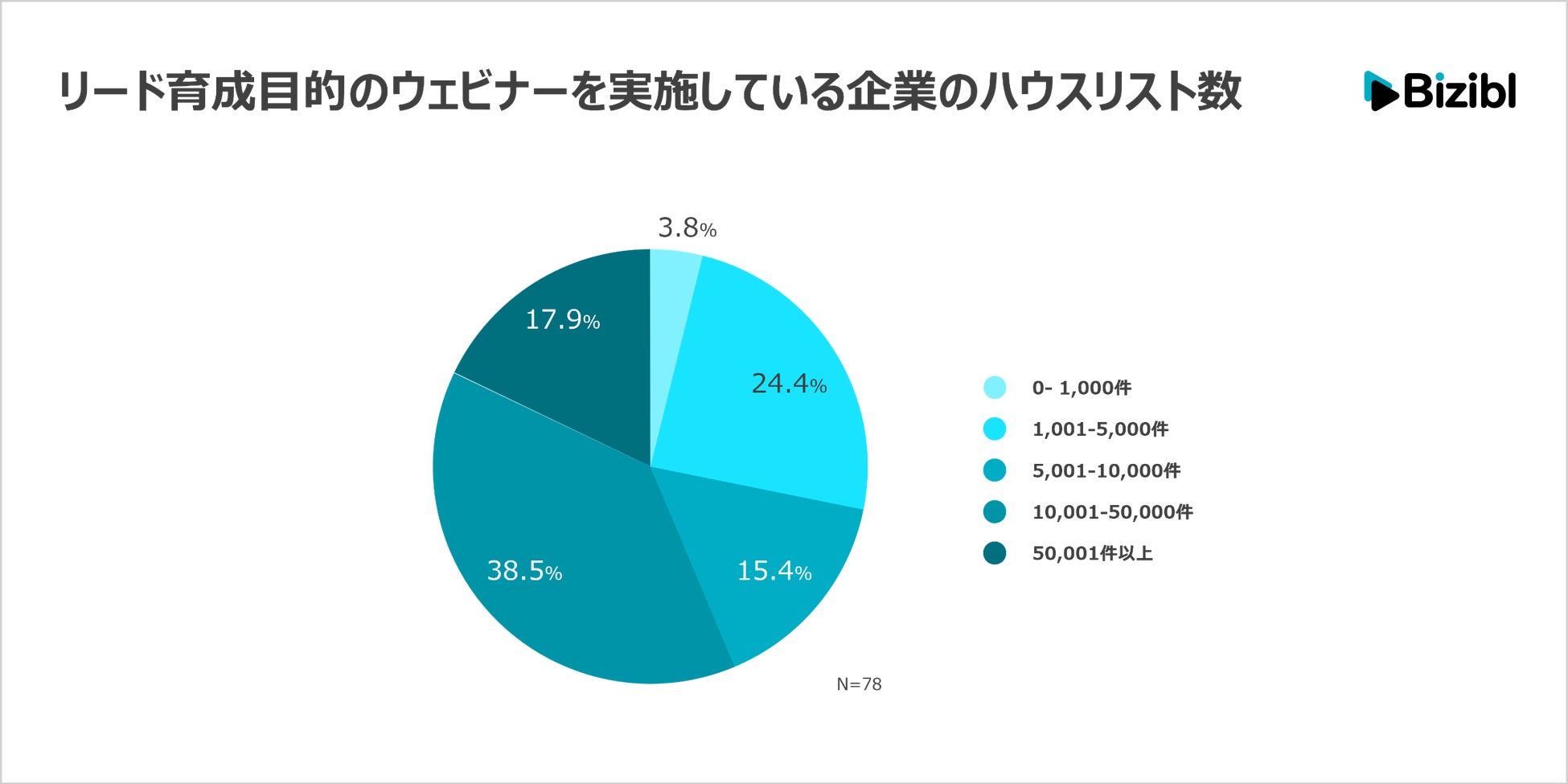 回答者のうち、リード育成目的でウェビナーを実施する企業(n=78)を対象に調査したところ、自社で抱えているハウスリストは「10,001-50,000件」が約39%と最も多い結果となりました。