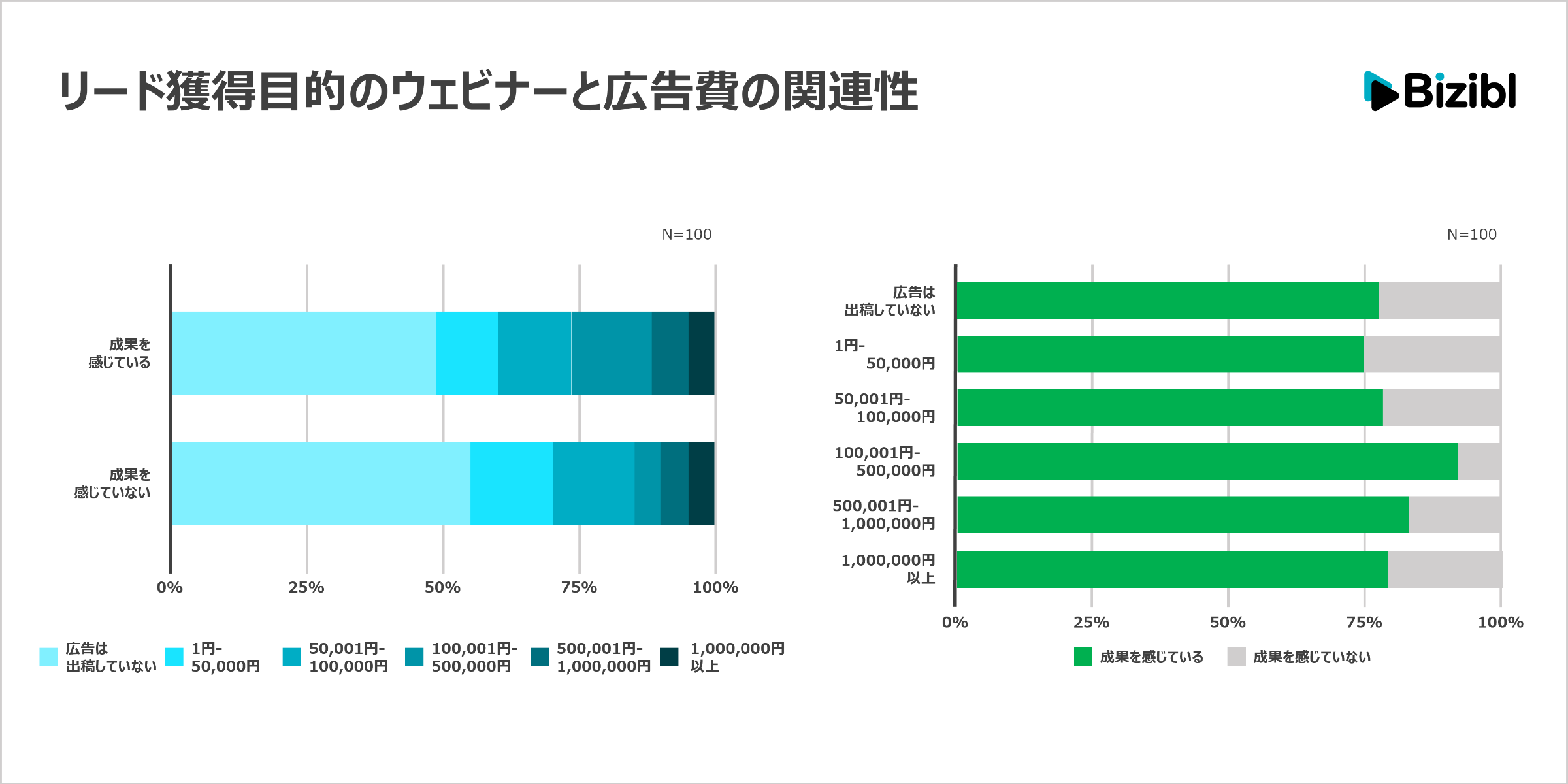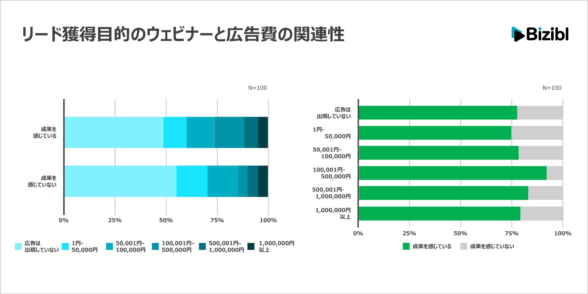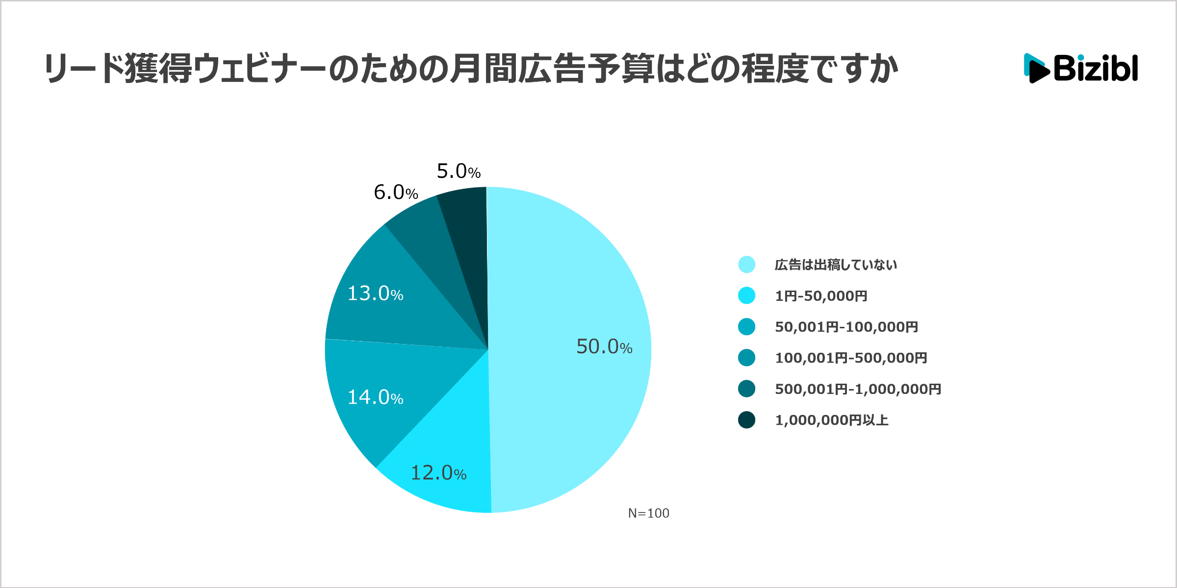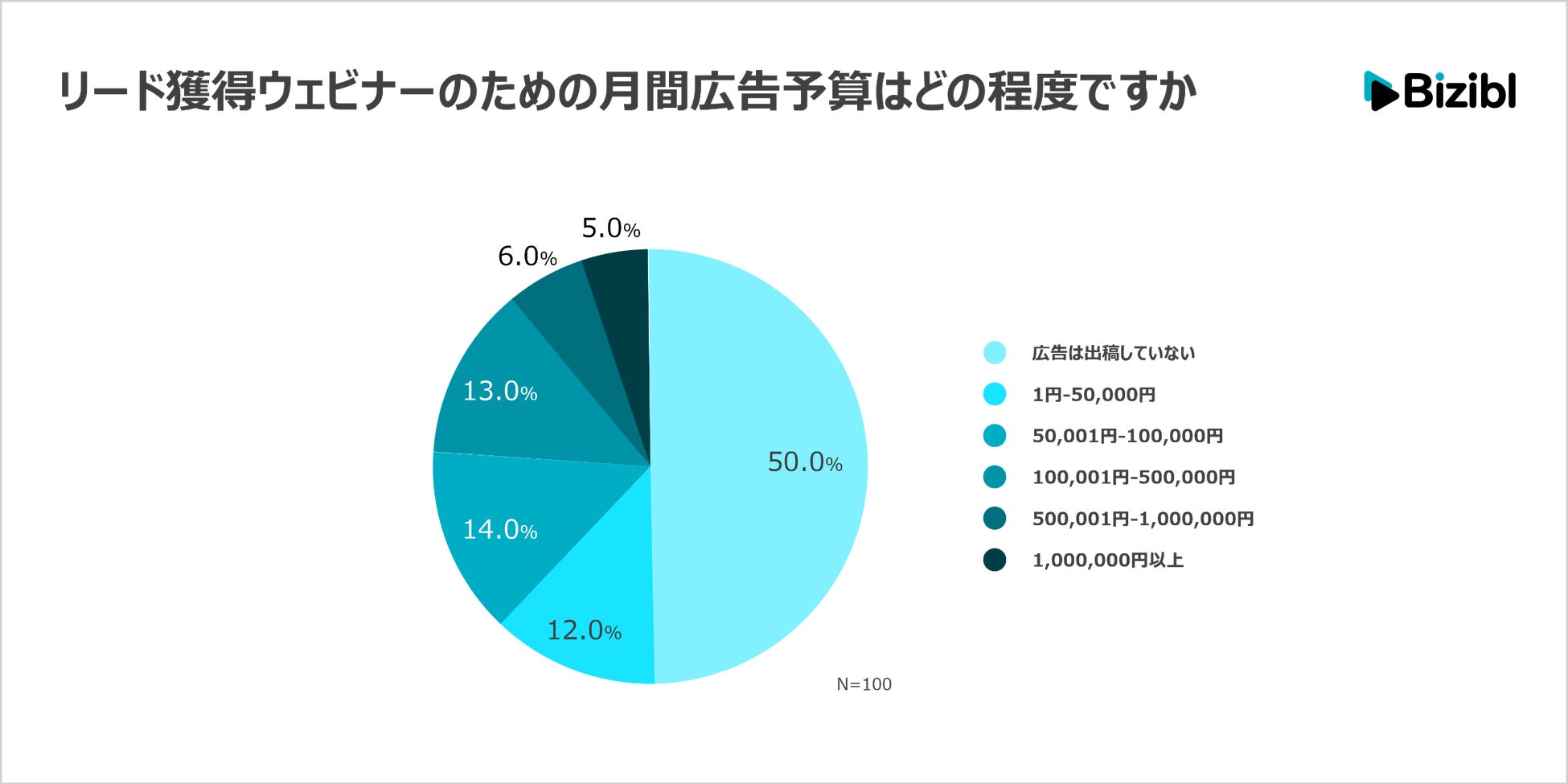 回答者のうち、リード獲得目的でウェビナーを実施する企業(n=100)を対象に調査したところ、「ウェビナー施策の広告費」は、「出稿していない」が50%と最も多い結果となりました。共催ウェビナーでの相互送客や無料告知媒体の活用、パートナー企業への集客協力依頼を活用することで、広告費を投下せずともリード獲得を期待することができるため、多くの企業がそういった施策に注力していることがうかがえます。