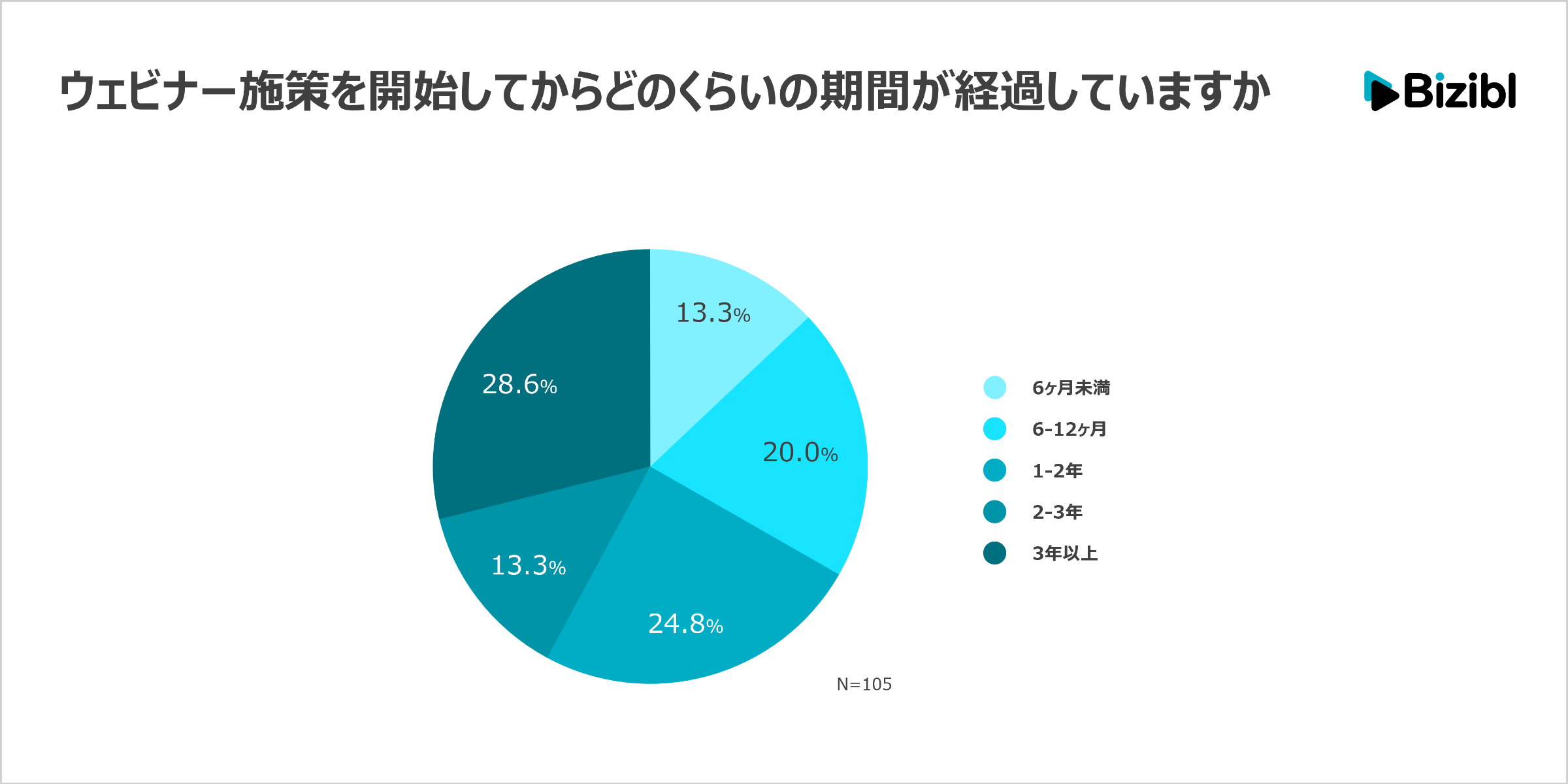 「ウェビナー施策を開始してからの期間」は、「3年以上」が約29%と最も多く、コロナ禍となりすぐに実施を開始した企業が多いことがうかがえます。