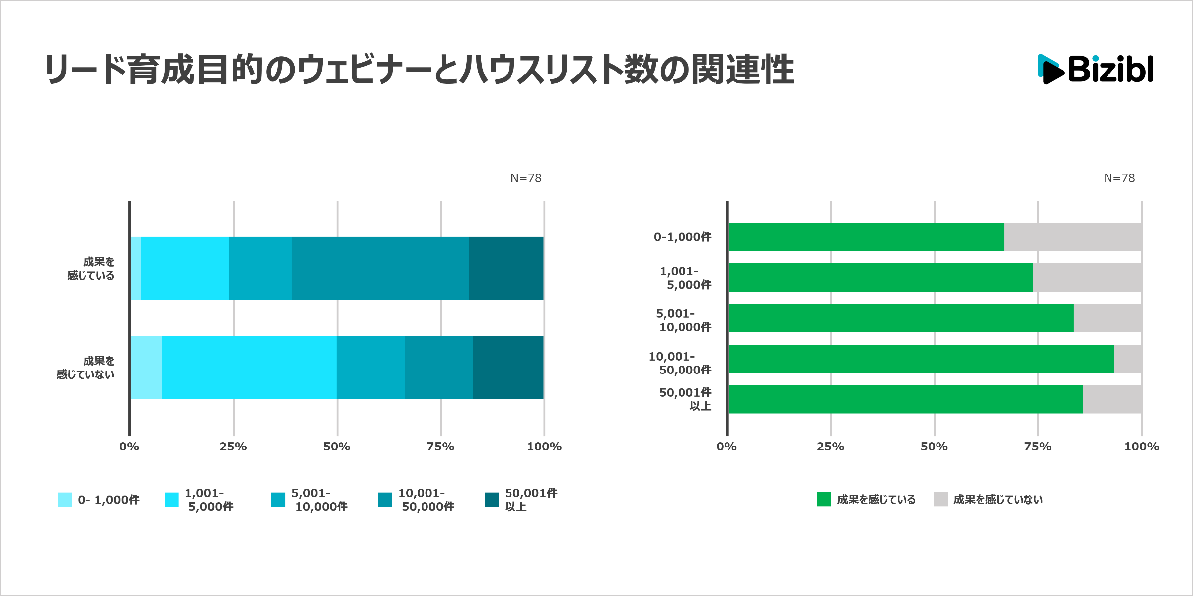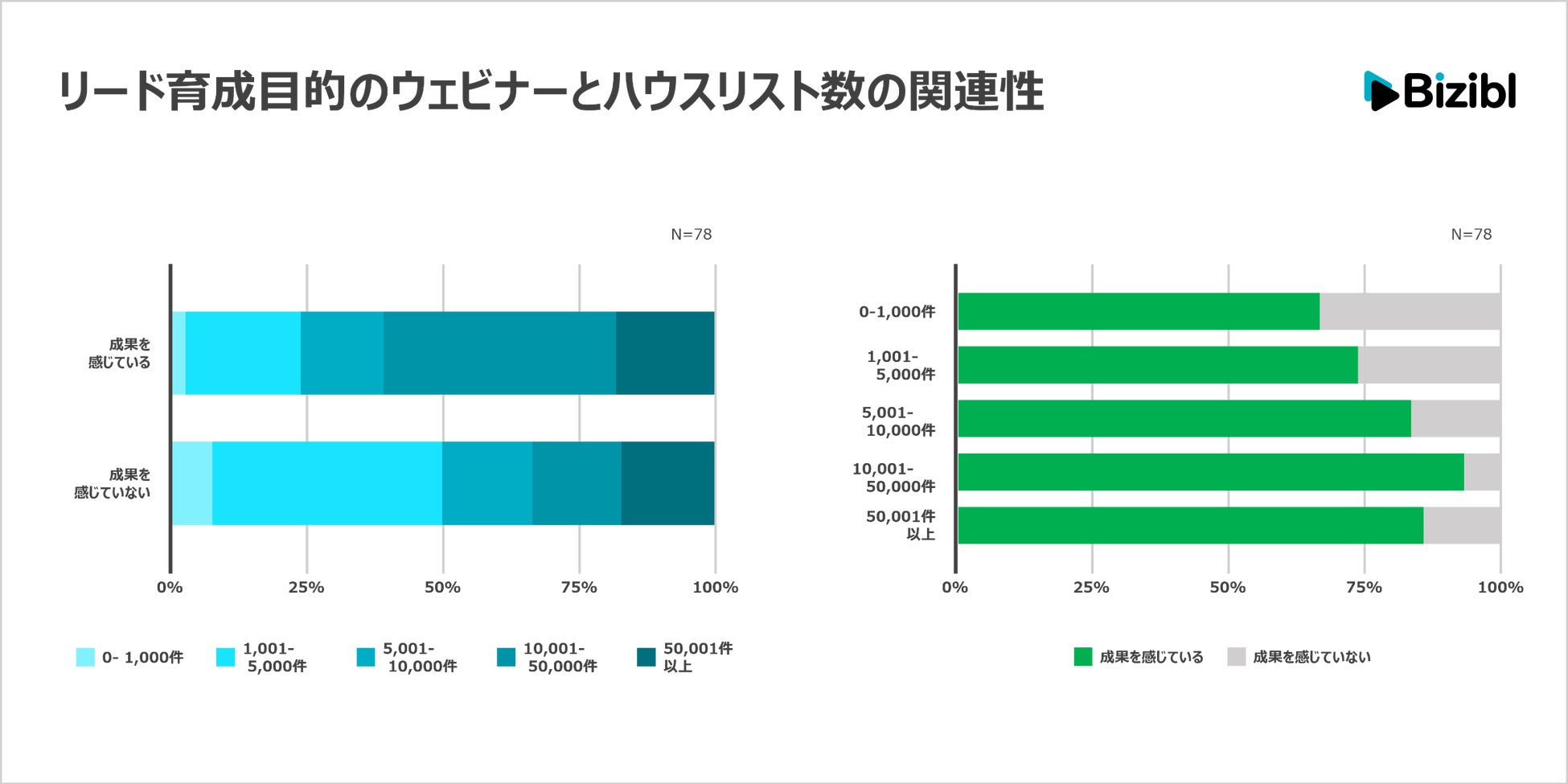 リード育成目的でウェビナーを実施する場合、ハウスリスト数が多いほど集客ができ、リード育成の成果を感じられていることがわかります。特に、ハウスリスト数が5,000件を超えると、成果を感じる企業の割合が80%を超えるため、リード育成目的でウェビナーを始める一つの閾値として捉えることもできるでしょう。