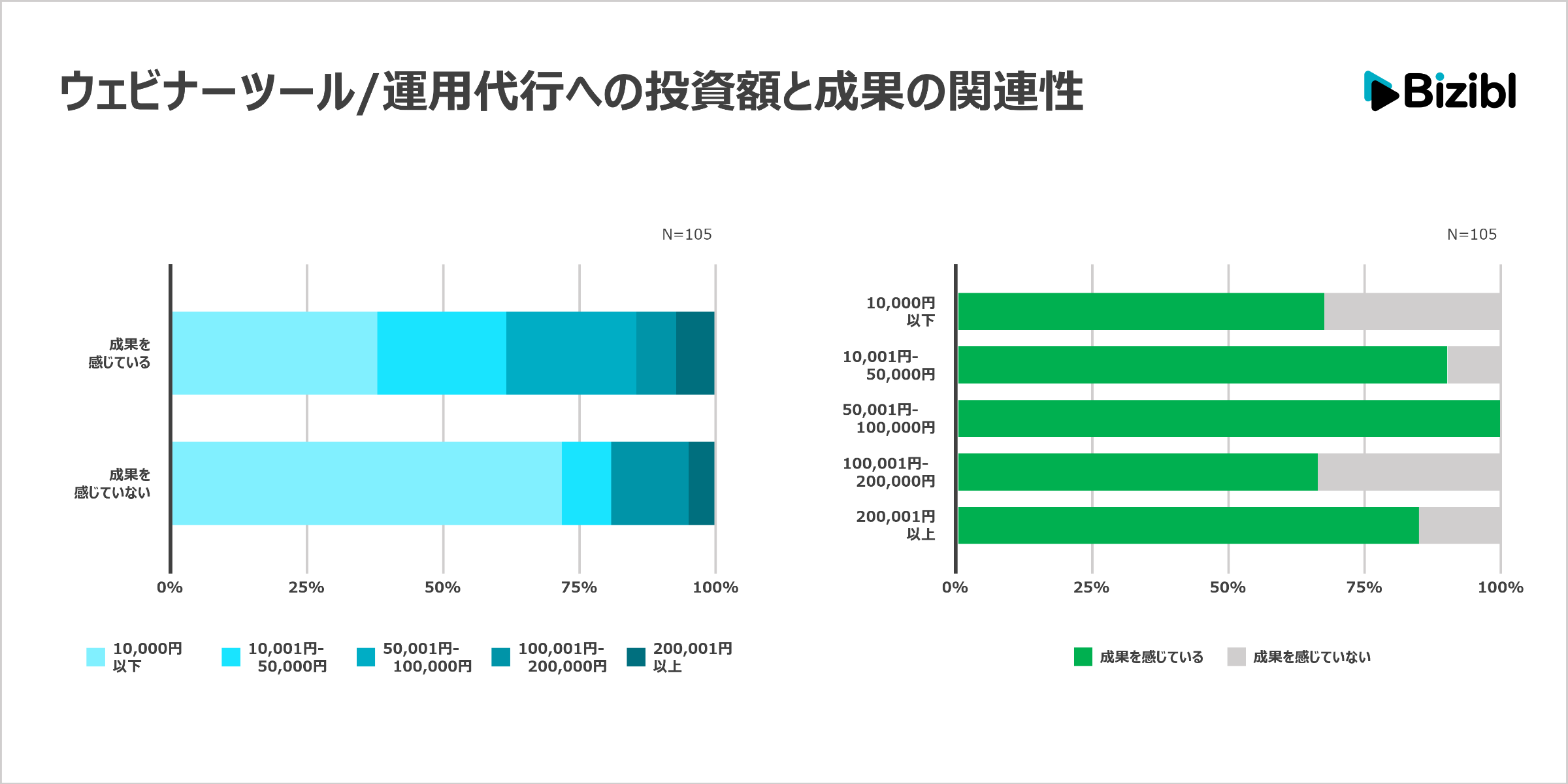 全体で見ると「10,000円以下」が約45%と最も多いものの、成果を感じている企業の半数以上は10,001円以上を投下していることがわかります。
