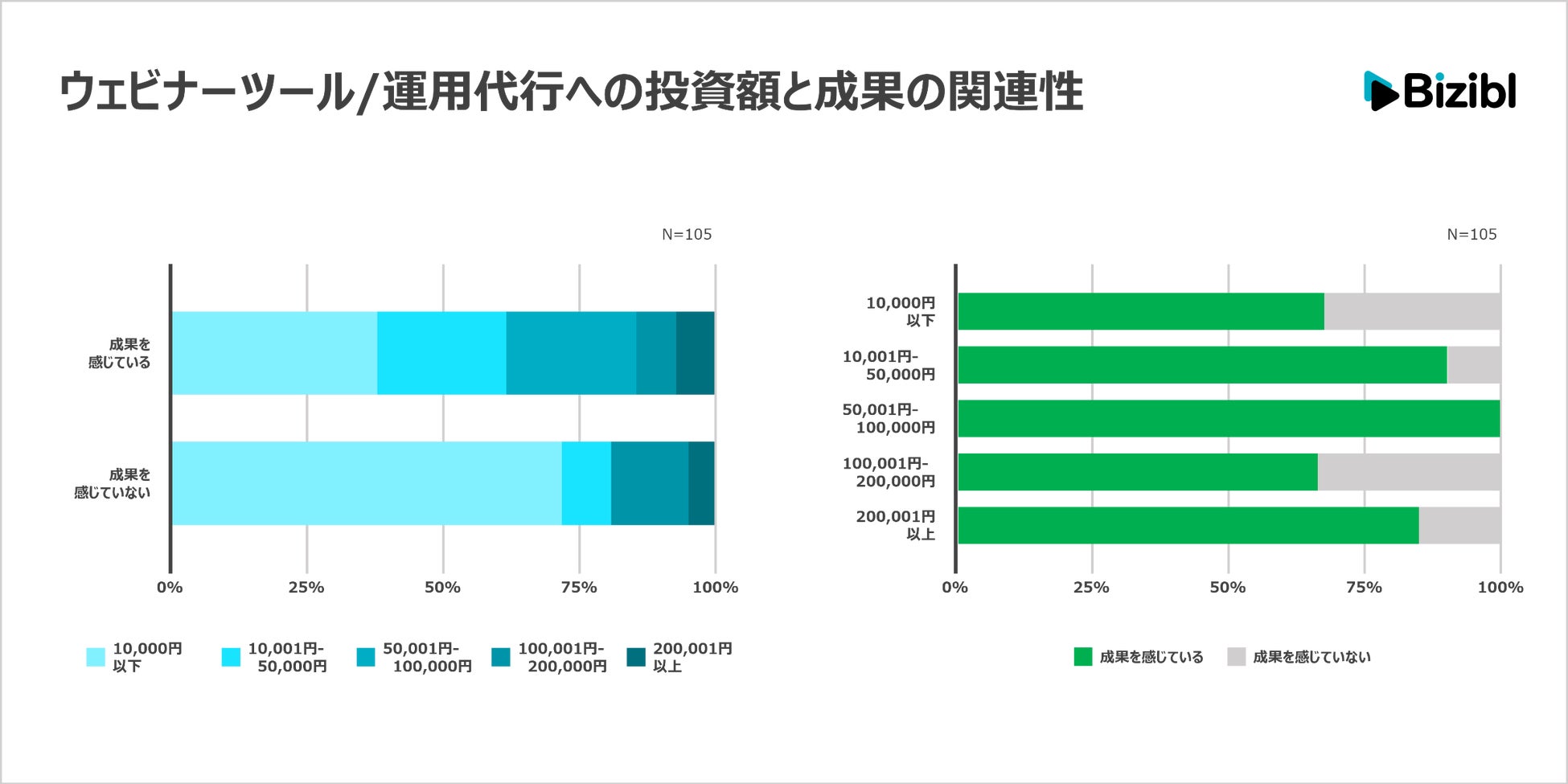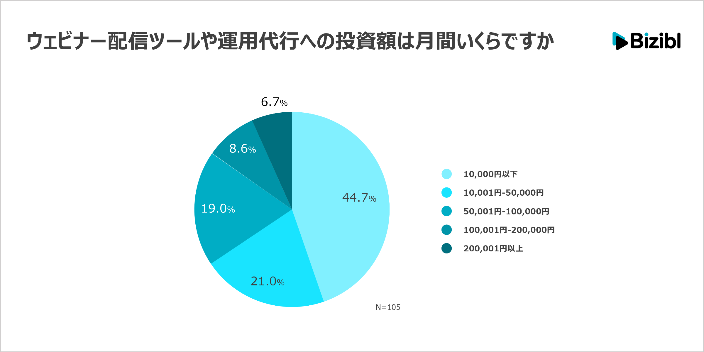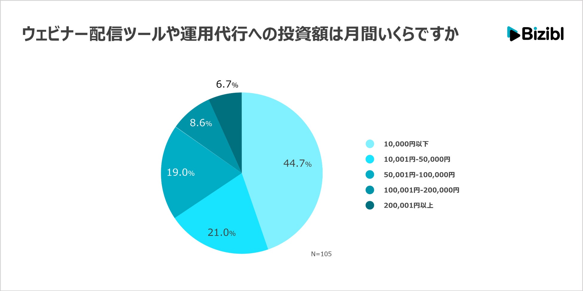 「ウェビナー運用(ツールまたは運用代行)への投資額」は、1ヶ月あたり「10,000円以下」が約45%と最も多い結果となりました。投資している企業においては「10,001-50,000円」が21 %、「50,001-100,000円」が19 %と、費用面は比較的抑えて実施している実態がわかります。