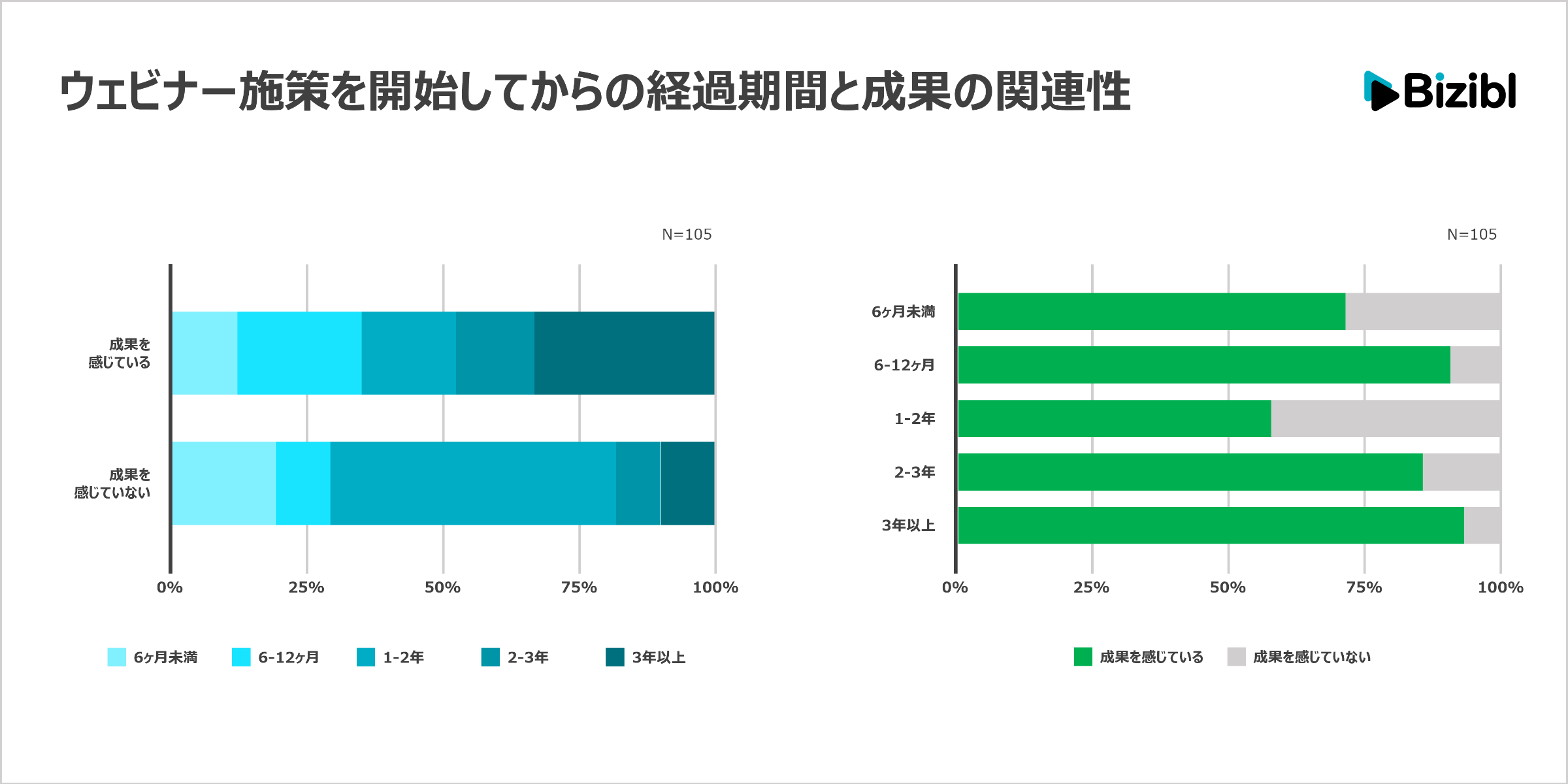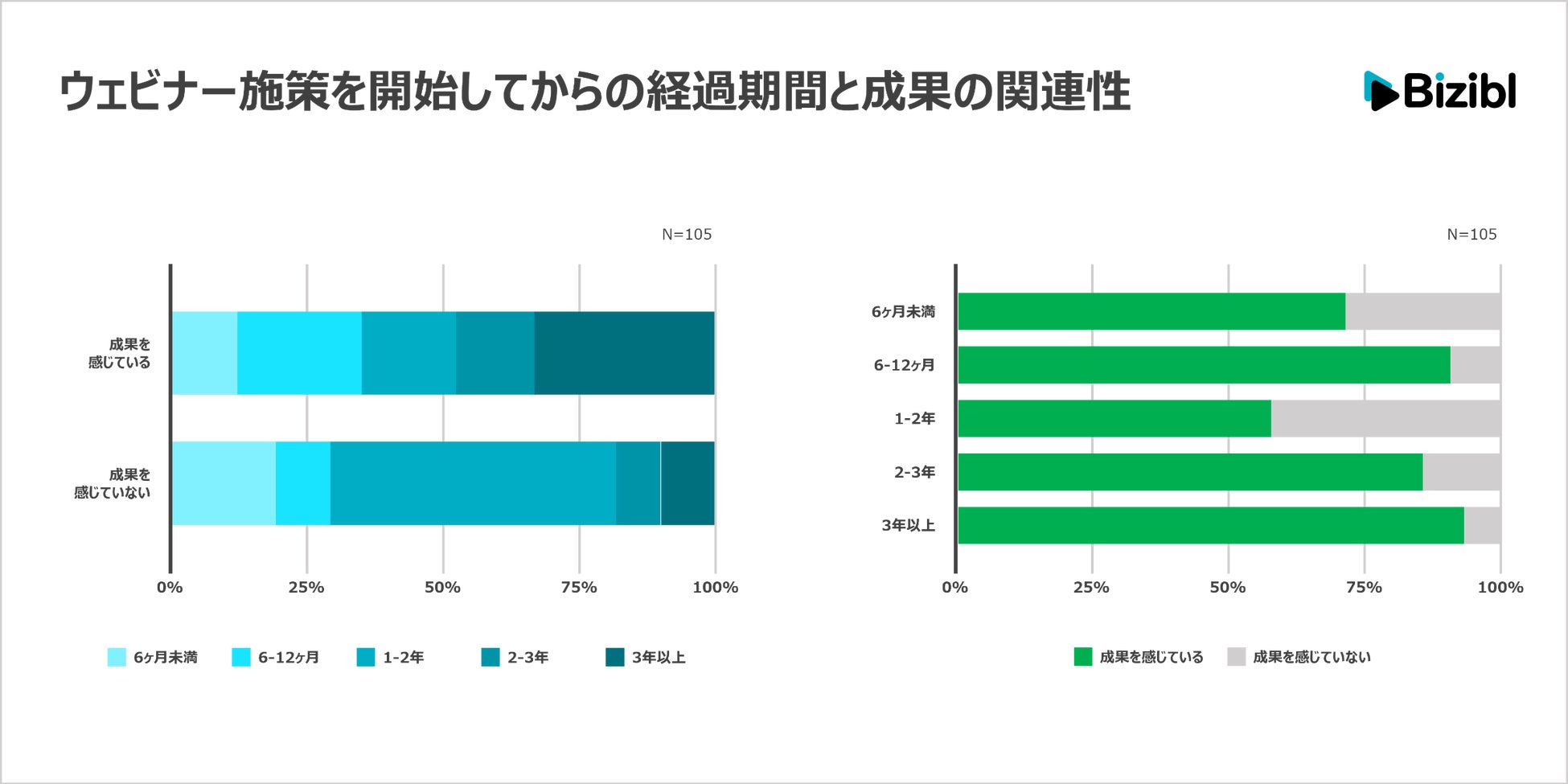 本調査結果から、ウェビナーは開始してから比較的短期間で成果を感じられる施策である一方、2年以上の長期的な取り組みの中でより成果を感じられる傾向にあります。そのため、施策開始時には長期的に運用を続けることを前提に体制を整えることが必要です。
