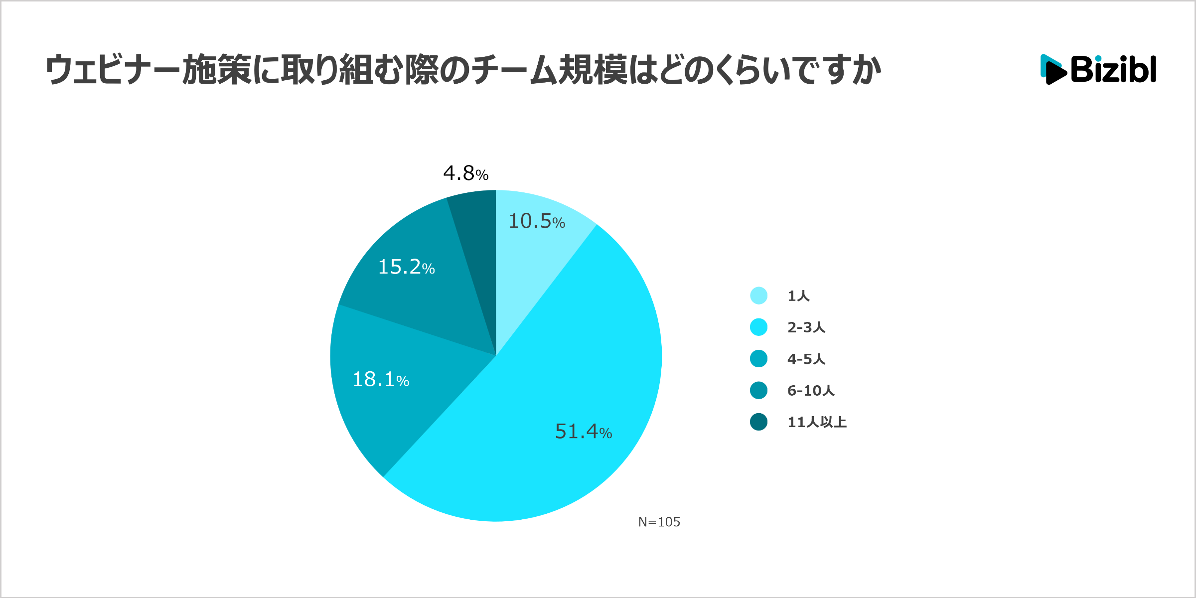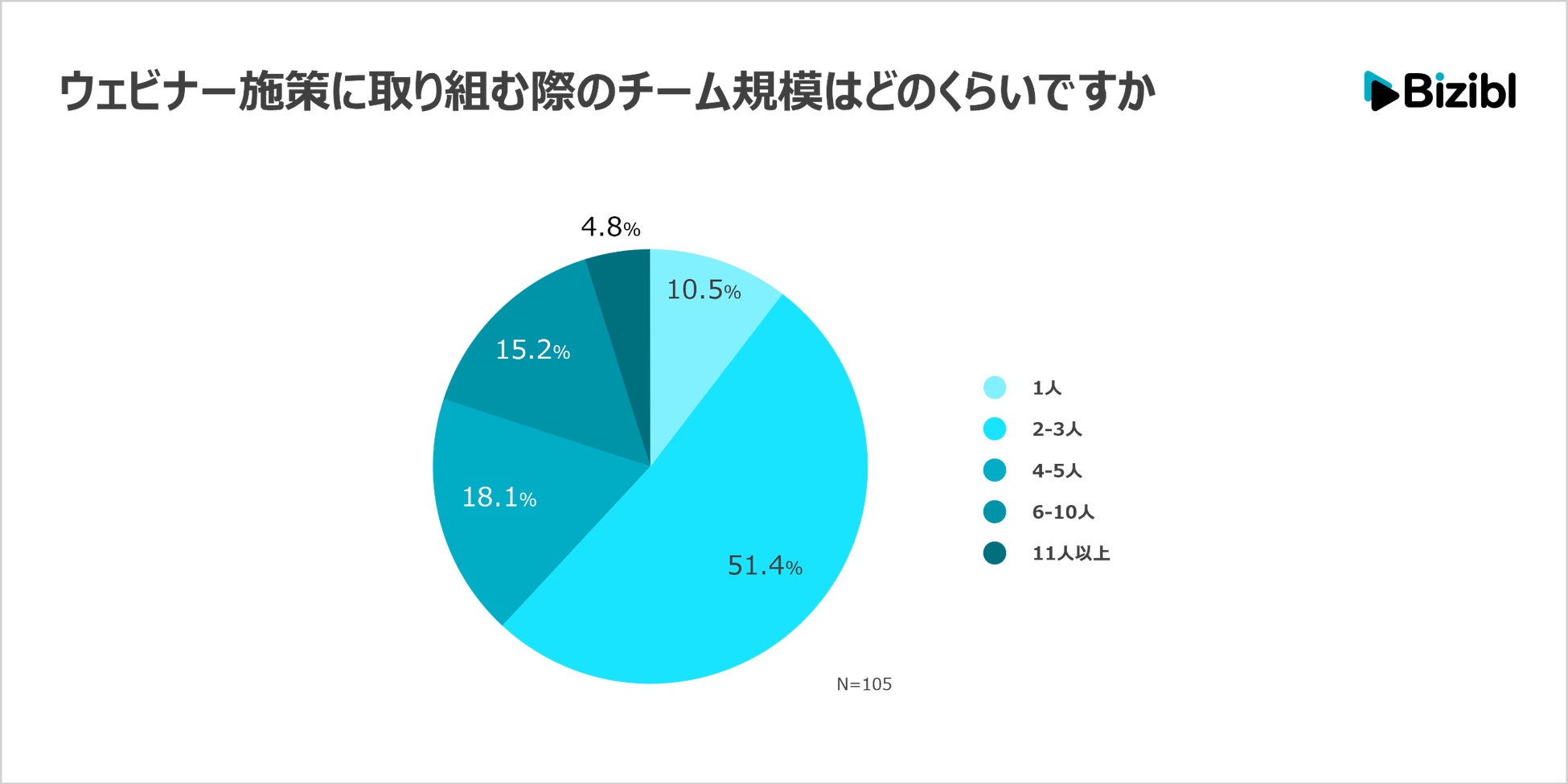 「ウェビナー運用への投下人員」は、「2−3人」が約51%と最も多く、「2人以上」での運用が90%となります。