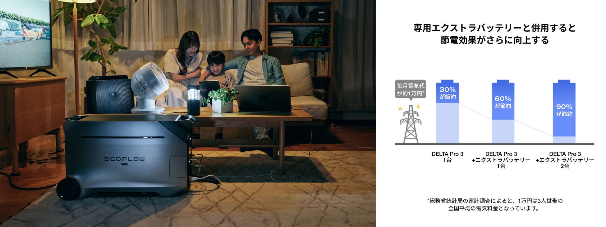 「DELTA Pro 3」があれば系統連係させない家庭用蓄電システムを簡単に構築でき、施工費用が削減されます。日中、太陽光発電で「DELTA Pro 3」に電気を蓄え、夜間にその蓄えた電力で家電製品に給電すると、仮に3人家族の場合、毎月電気代が約1万円だとすると、1台の「DELTA Pro 3」で毎月約30%もの電気代削減を実現でき、2台の専用エクストラバッテリーと組み合わせると最大90%節電効果が期待できます*。「DELTA Pro 3」は導入後、設置工事なしで簡単に容量を拡張可能。