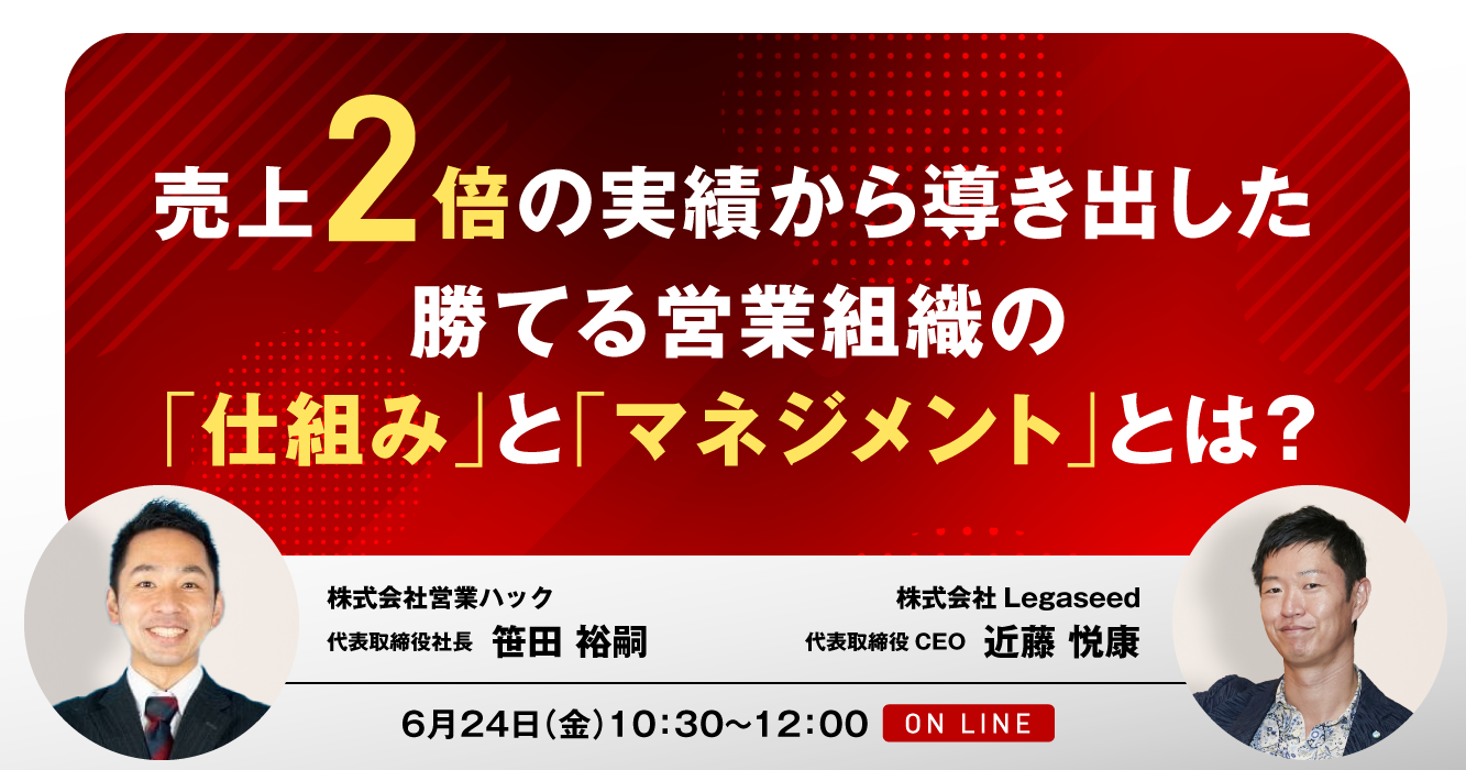 企業にとって営業活動は存続の要です。日々、マーケティングや営業マンの教育、営業チームの仕組みづくりなどに奮闘されていることでしょう。では、どうすれば売上を2倍にすることができるのでしょうか?今回は「人と組織の成長」をミッションに掲げる株式会社Legaseed近藤代表と「営業の悩みを0にする」営業コンサルティング会社株式会社営業ハックの笹田が売上を2倍にする営業組織のつくり方をお伝えします。営業の戦力不足を解消し確実に売上目標を達成する営業組織を作りたい経営者・営業責任者の方は是非ご参加ください!