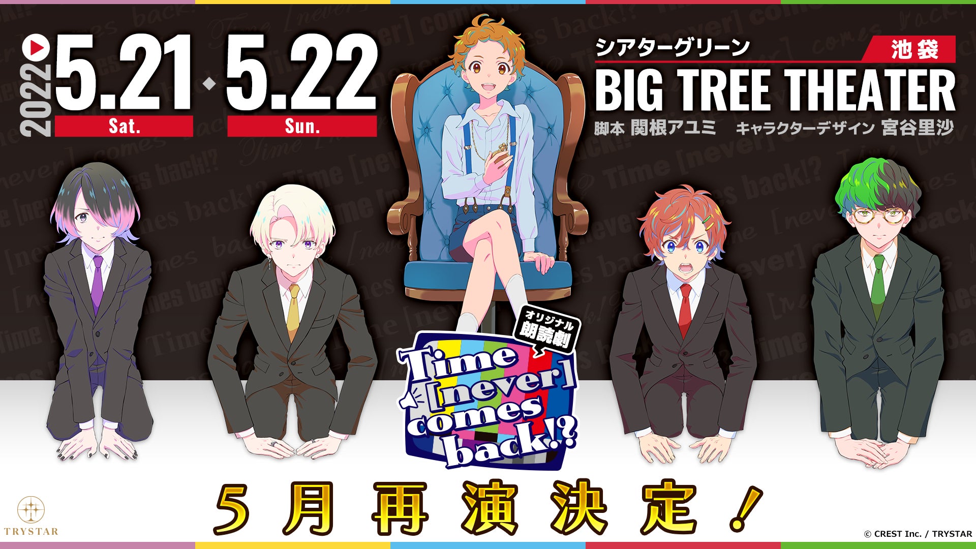 株式会社CRESTが展開するブランド『TRYSTAR(トライスター)』は、2022年5月21日(土)・22日(日)にオリジナル朗読劇<Time [never] comes back!?>(13:00公演/16:30公演/19:00公演、会場:BIG TREE THEATER)を再上演いたします。早期チケット受付(抽選販売)は4月1日(金)午前10時より開始となります。