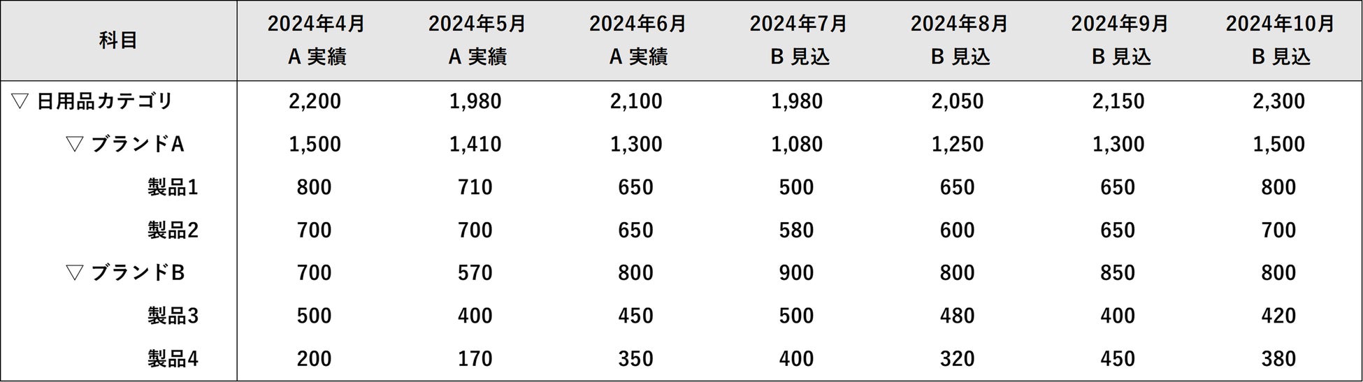 例2)ドリルダウン形式で、製品別売上の見込管理をしたい