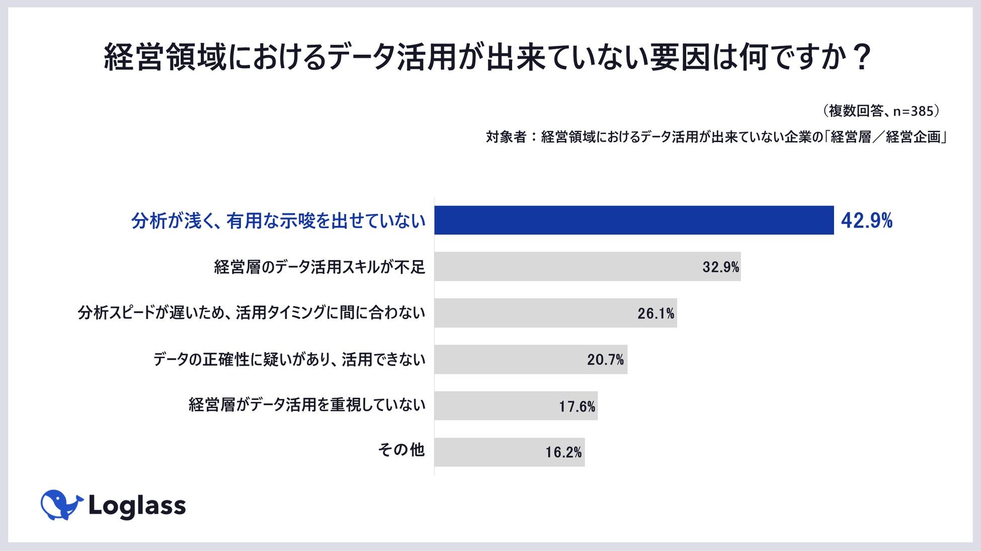 当社が今年3月に売上10億円以上の企業の経営層・経営企画担当 計978名を対象に行った調査では、「経営領域におけるデータ活用が出来ていない」と回答した企業のうち、その要因として最も多く挙がったのが「分析が浅く、有用な示唆を出せていない」という回答で、全体の4割以上にのぼりました。