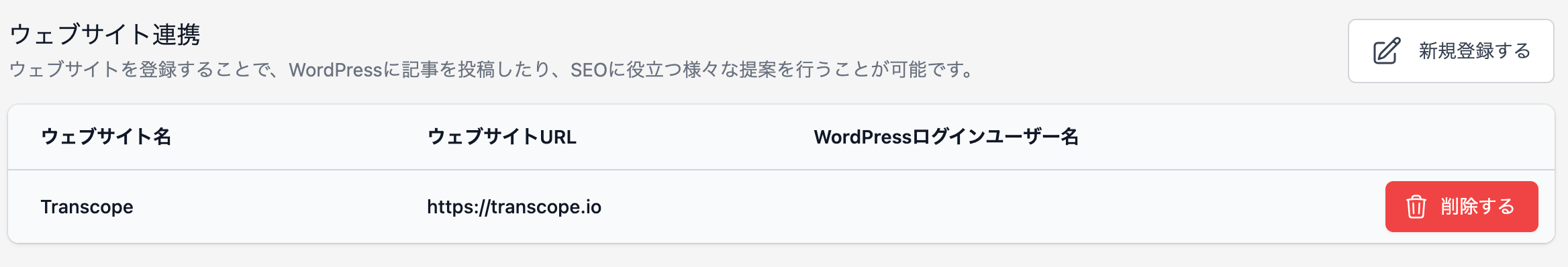 Transcopeの[設定]メニューの[ウェブサイト連携]セクションから、運営サイトの情報をご入力いただけましたら幸いです。