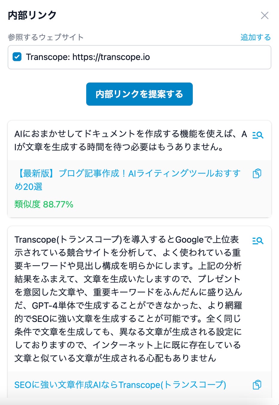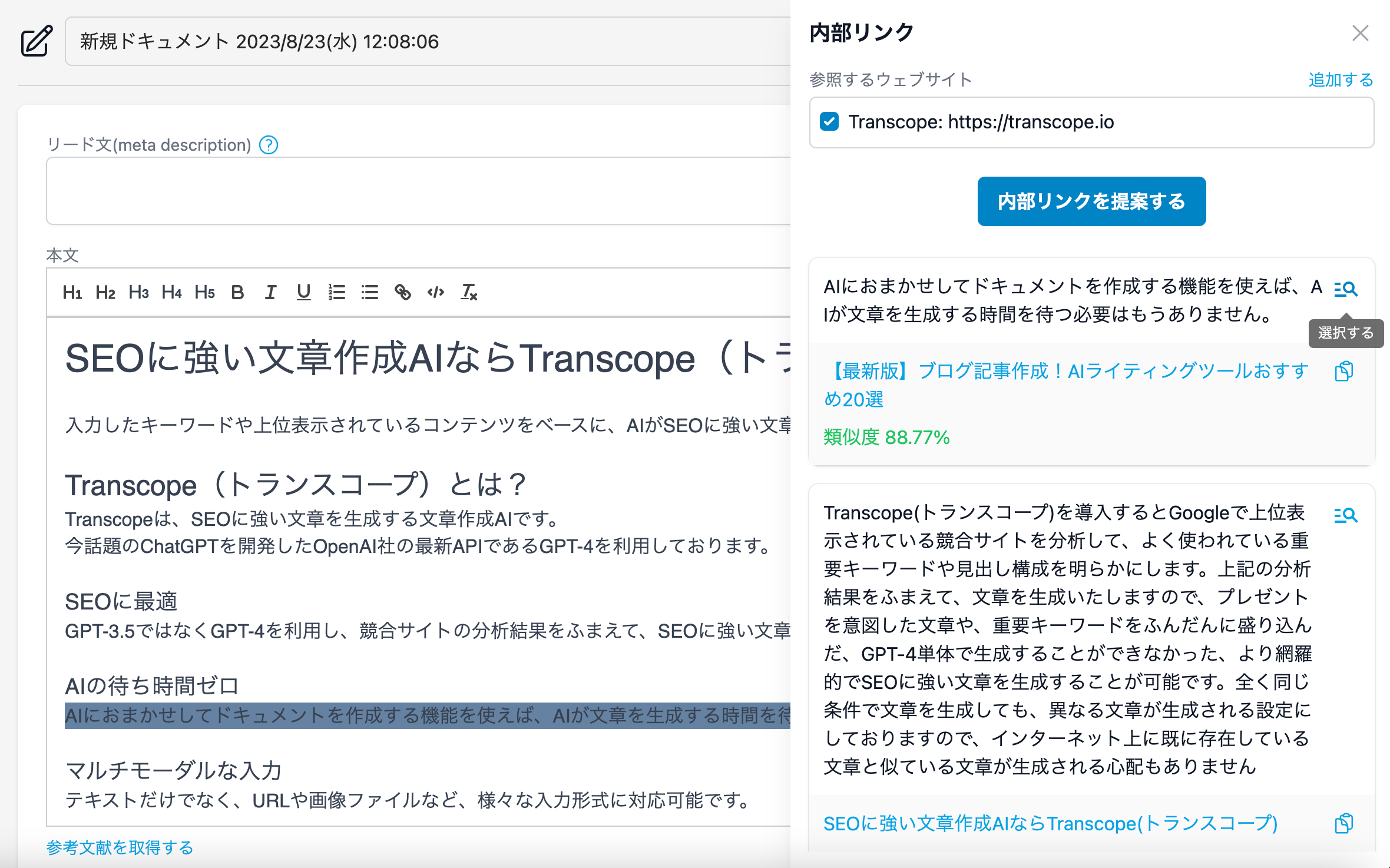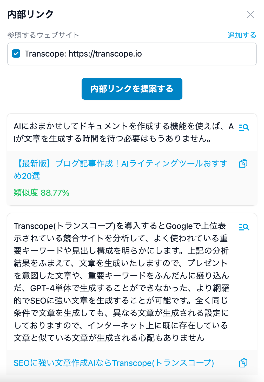 上記のご意見をうけて、Transcopeで書いた記事から、貴社の既存のコンテンツに対して、カンタンに内部リンクを張れる機能をリリースいたしました。当機能により、手動で内部リンキングをする手間がなくなり、より一層の業務効率化を進められます。