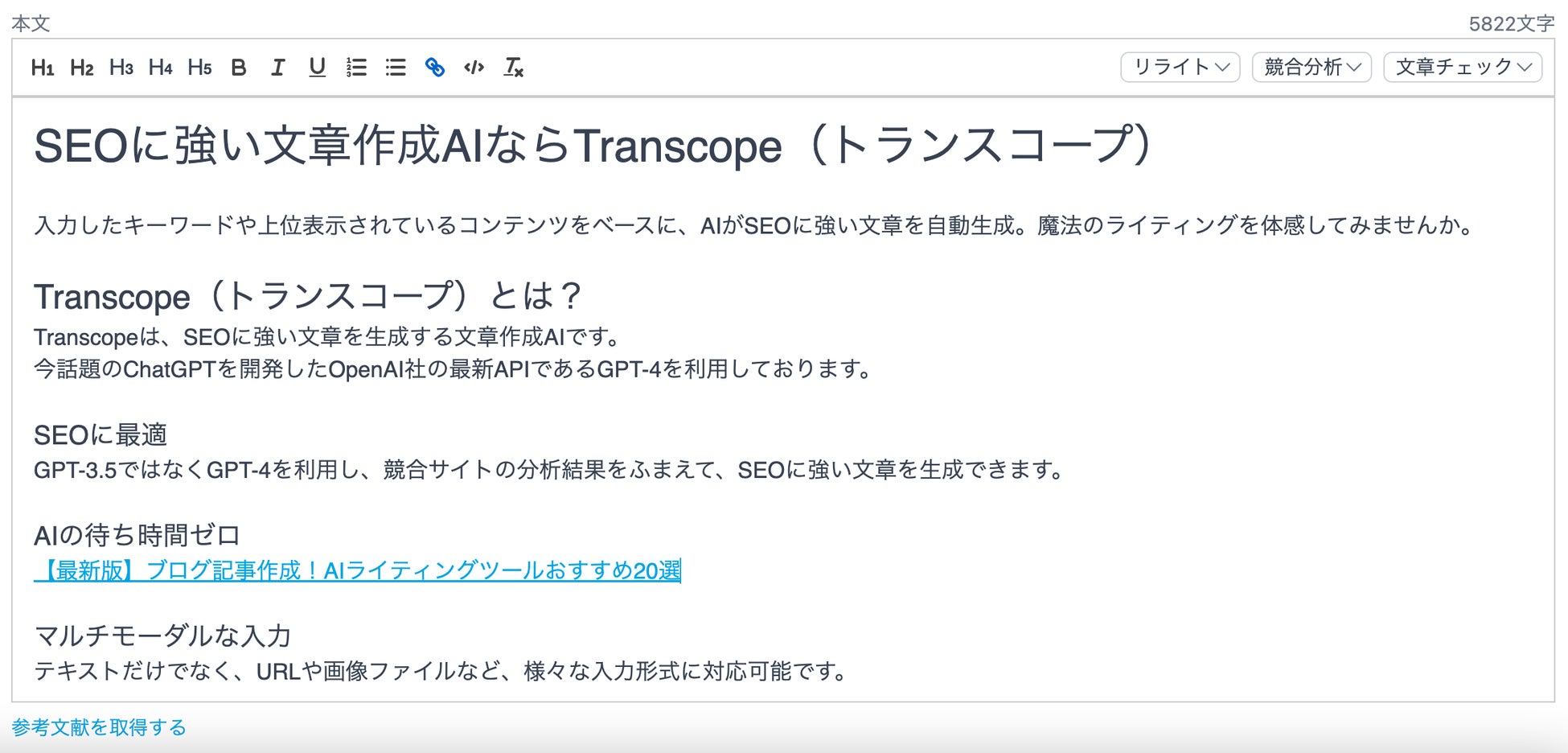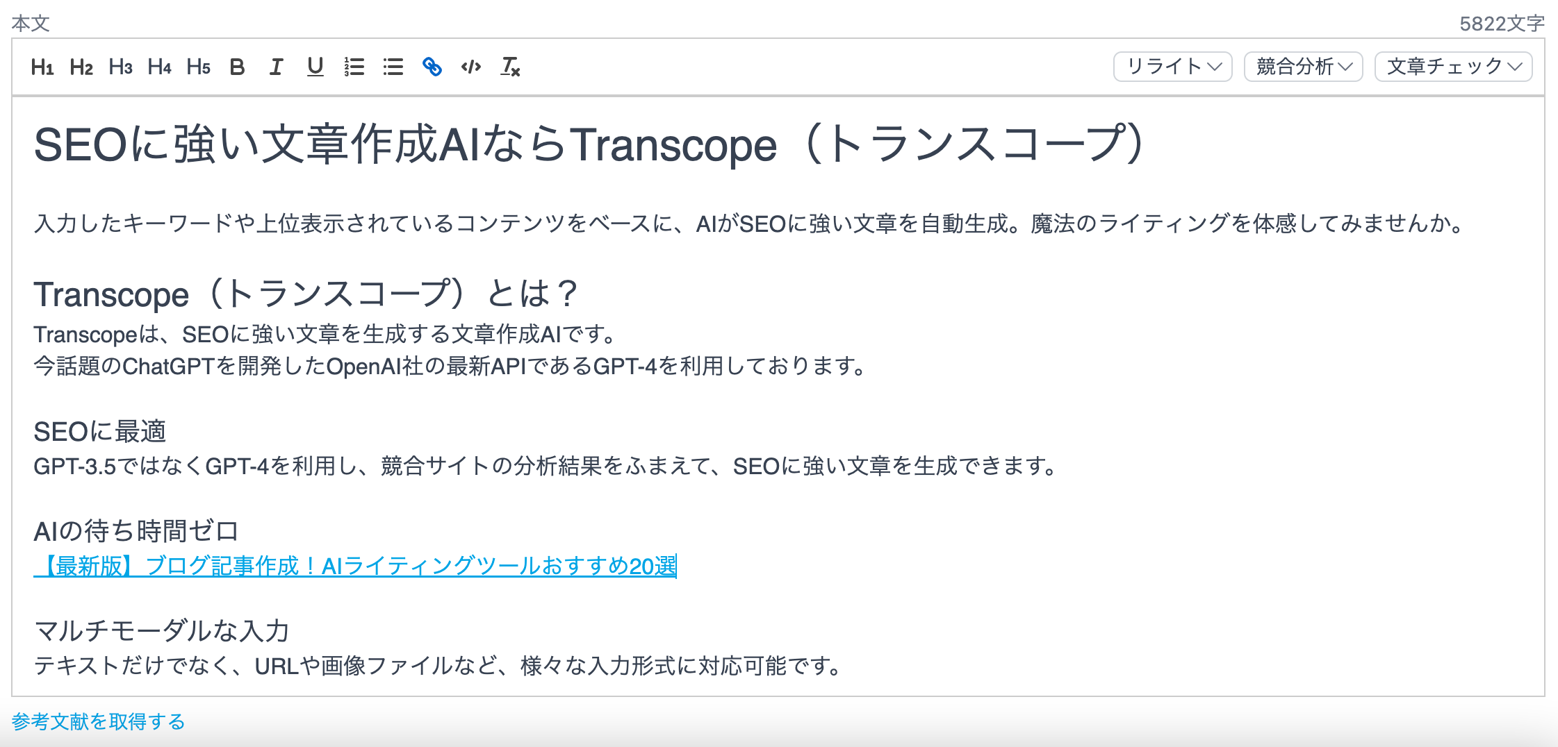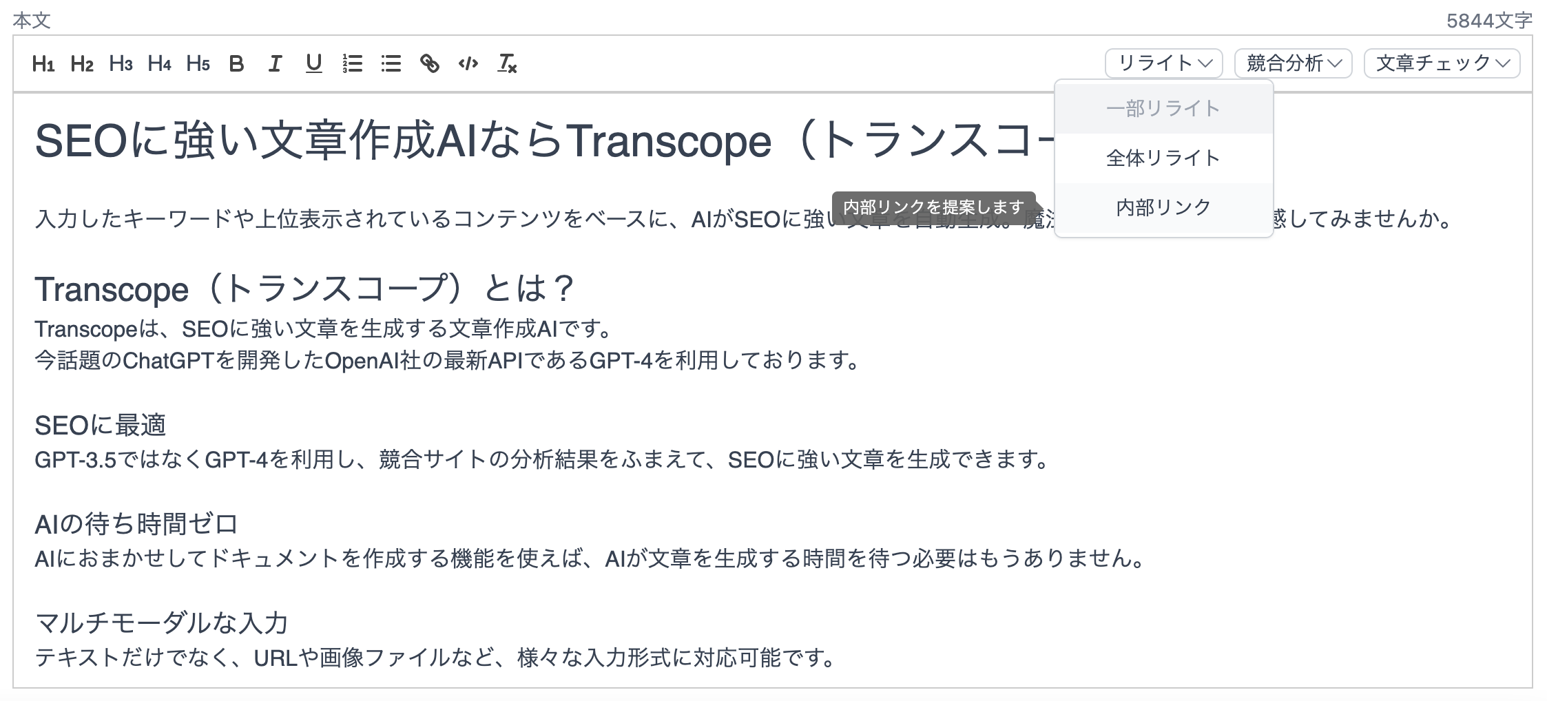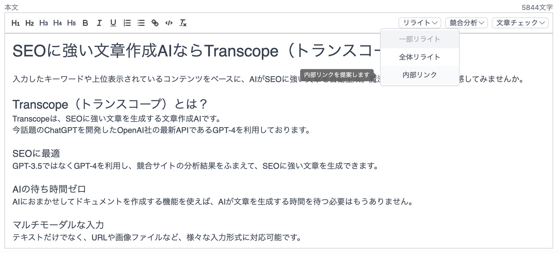 上記のご意見をうけて、Transcopeで書いた記事から、貴社の既存のコンテンツに対して、カンタンに内部リンクを張れる機能をリリースいたしました。当機能により、手動で内部リンキングをする手間がなくなり、より一層の業務効率化を進められます。