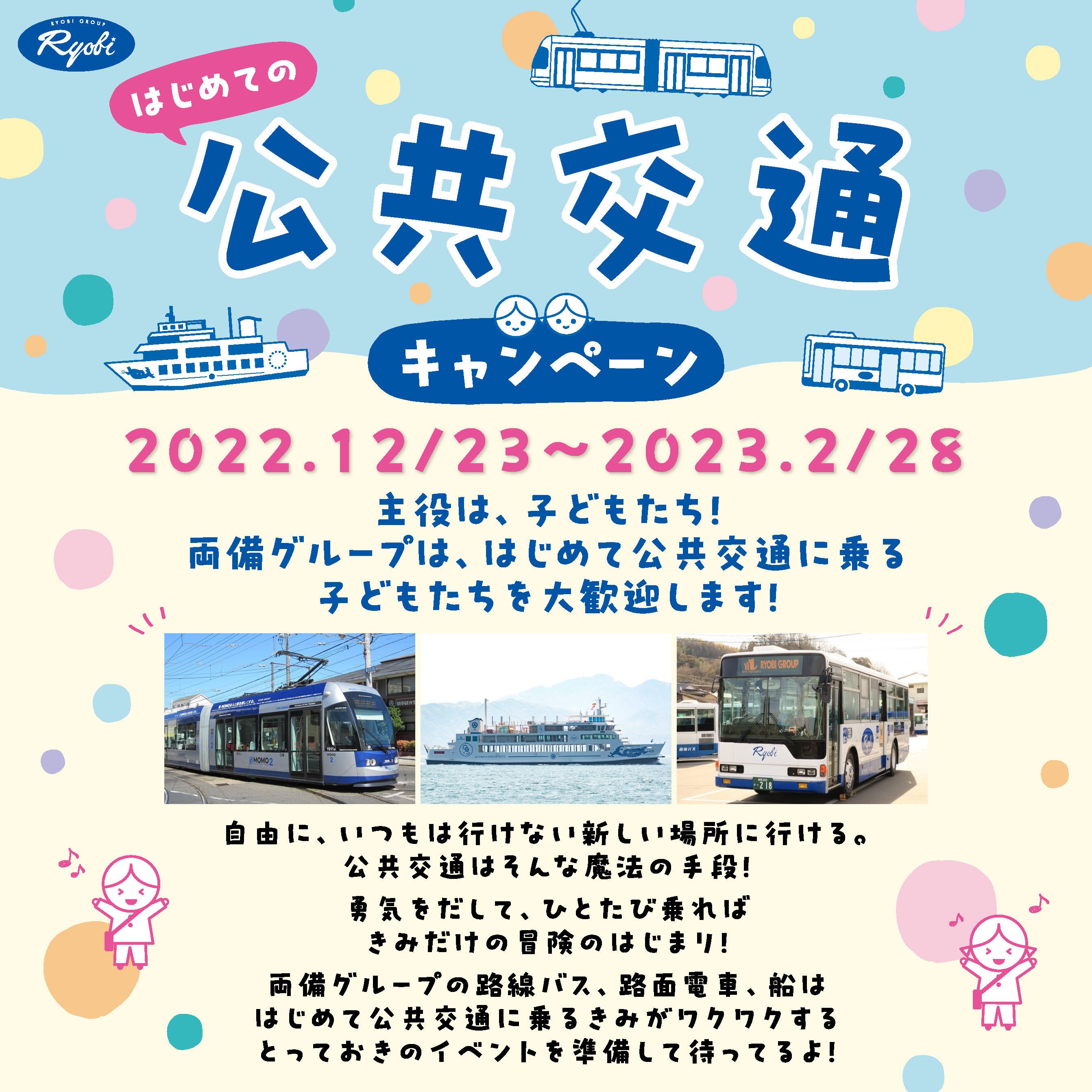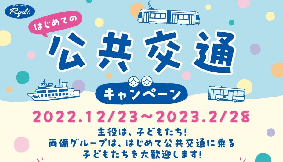 両備グループの岡山県内をエリアとする公共交通事業会社、両備ホールディングス株式会社両備バスカンパニー、岡山電気軌道株式会社、株式会社井笠バスカンパニー、東備バス株式会社、国際両備フェリー株式会社、瀬戸内観光汽船株式会社では、岡山県が現在実施中の公共交通乗車キャンペーンにあわせ、2022年12月23日(金)から2023年2月28日(火)まで、「はじめての公共交通キャンペーン」(https://ryobi.gr.jp/ryobi-hajimete/)と題し、お子様を対象とした様々なイベントやプレゼント企画を実施しますのでお知らせいたします。