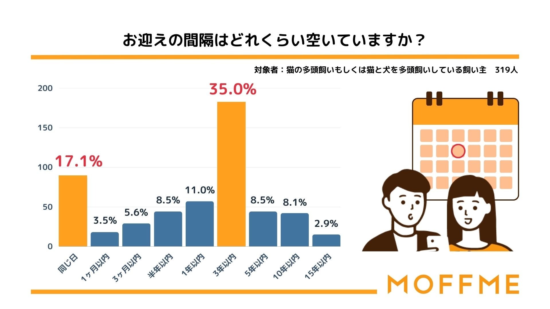 多頭飼いをしている飼い主さんに、お迎え時期の間隔について質問したところ、1番回答が多かったのは、「3年以内だった」という回答。