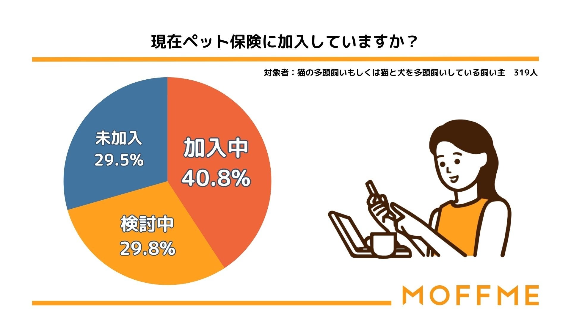 MOFFMEでは調査を行う際にペット保険の加入率についても調査をしていますが、今回は多頭飼いをしている人が対象であるからか、過去の調査に比べて加入率が低い40.8%となりました。