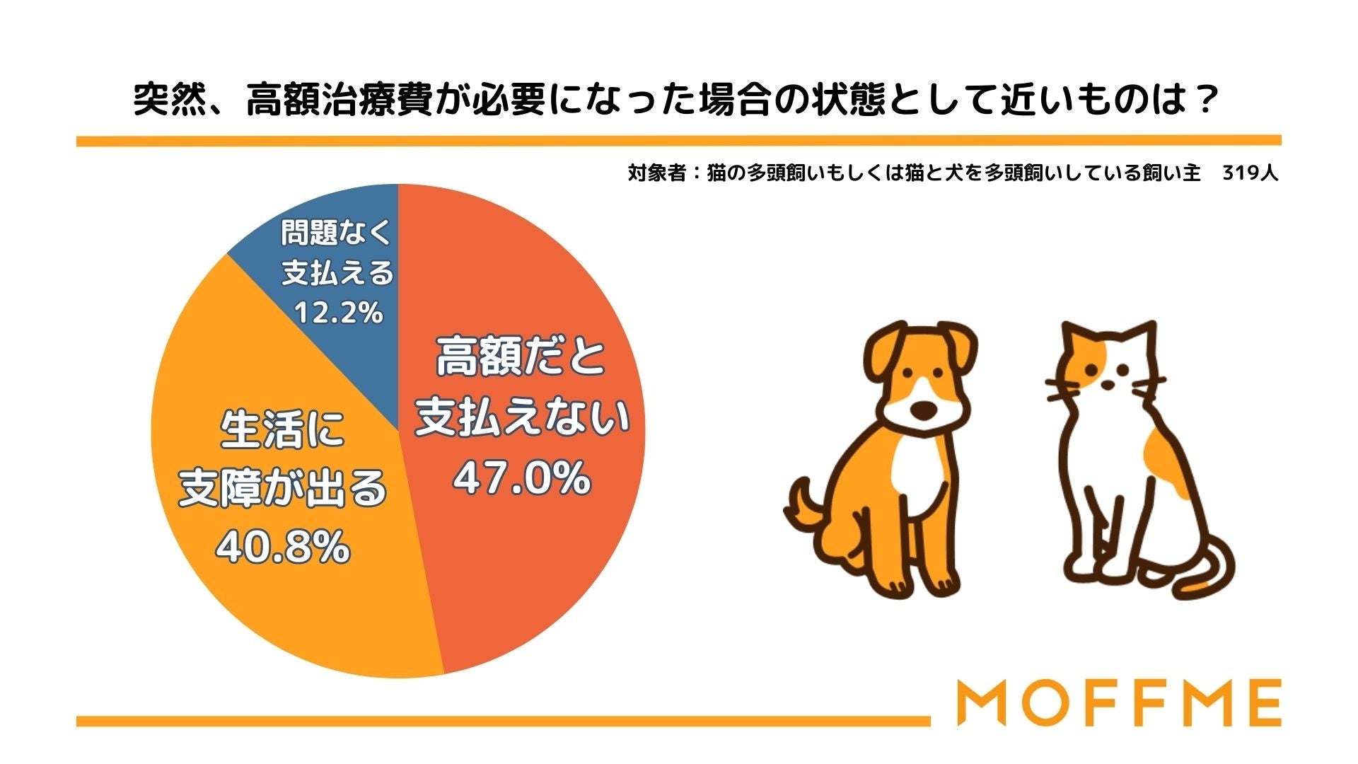 今回は一例として、犬や猫が心臓病になった際の手術・治療費150万円〜200万円が必要になってしまった場合の状況として最も近いものとして、「高額で支払ない」と回答した人が47%と約半数がペットが重い病気などで高額治療費が必要になった際の対策ができていないことが判明しました。