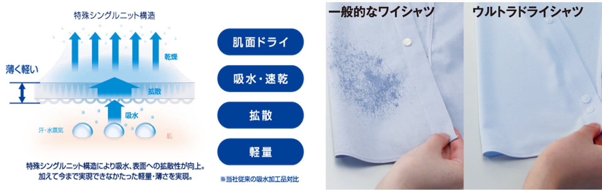 汗をかきやすい季節は、着用するシャツの素材や色によっては、汗でシャツが濡れることで“汗ジミ”が目立ってしまっていることが見受けられます。清潔感のある印象を心がけたいビジネスパーソンにとって、背中や脇の周りなどの汗ジミ対策は気になるポイントのひとつです。そこでコナカ・フタタでは、夏のビジネスパーソンの悩みに着目し、水分が素早く拡散する素材を採用することで、着用中の汗ジミを軽減する『ウルトラドライシャツ』を開発しました。